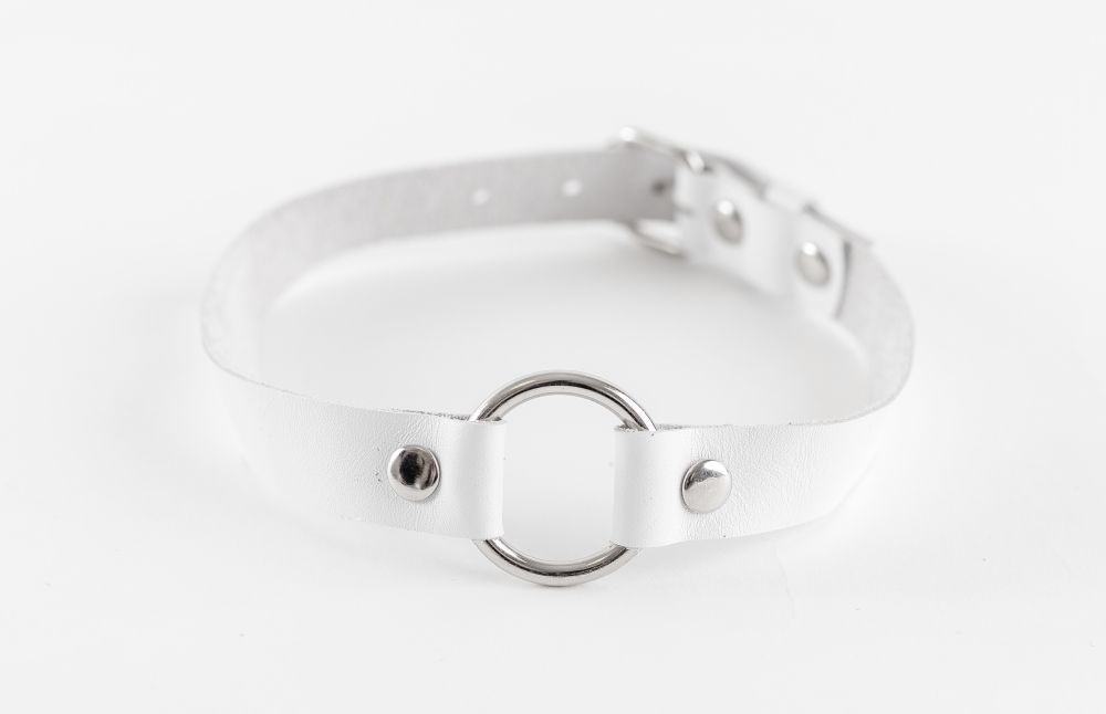 Элегантный чокер из натуральной кожи белого цвета, декорирован металлическим кольцом. Удобно регулируемая длина чокера отлично подойдет на обхват шеи от 30 до 40 см. Нежная натуральная кожа очень комфортна в использовании. Ширина ремня – 2 см. Диаметр кольца – 3 см.