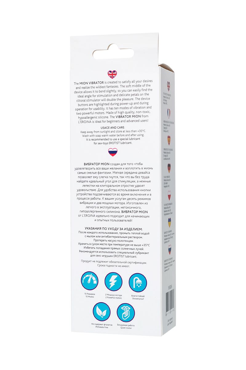 Вибратор Mion создан для того чтобы удовлетворить все ваши желания и воплотить в жизнь самые смелые фантазии. Мягкая середина девайса позволяет ему слегка гнуться, так что вы без труда найдете идеальный угол для стимуляции, а нежные лепестки на клиторальном отростке удвоят удовольствие. Для удобства использования кнопки устройства подсвечиваются во время включения и в процессе работы. К вашим услугам десять режимов вибрации и два мощных мотора. Изготовлен из легкого в эксплуатации, нетоксичного, гипоаллергенного силикона. Вибратор Mion от L’EROINA идеально подходит для начинающих и опытных пользователей! Рабочая длина – 13 см. Диаметр клиторального отростка – 2,3 см.