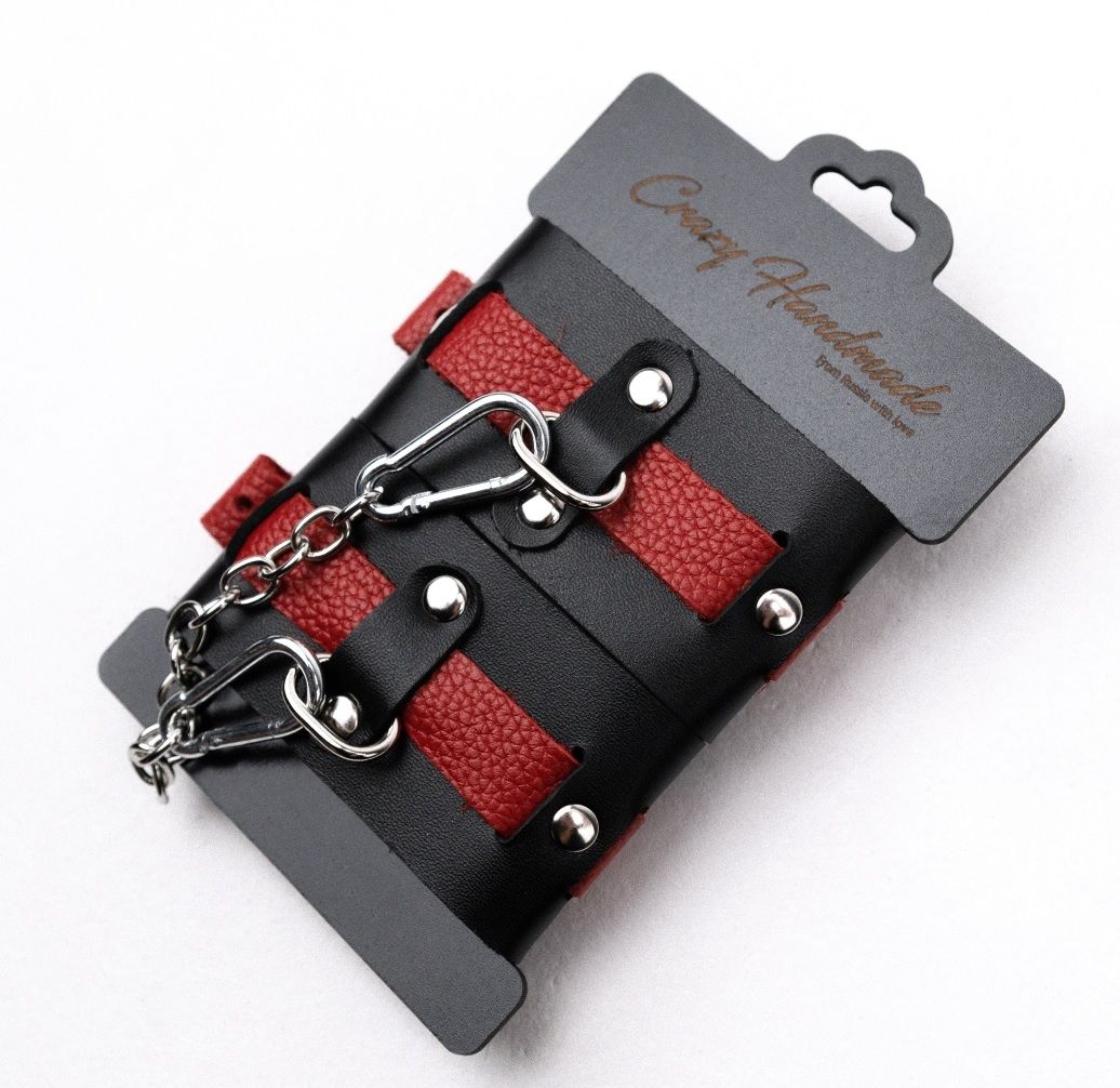 Черно-красные кожаные наручники на металлической сцепке