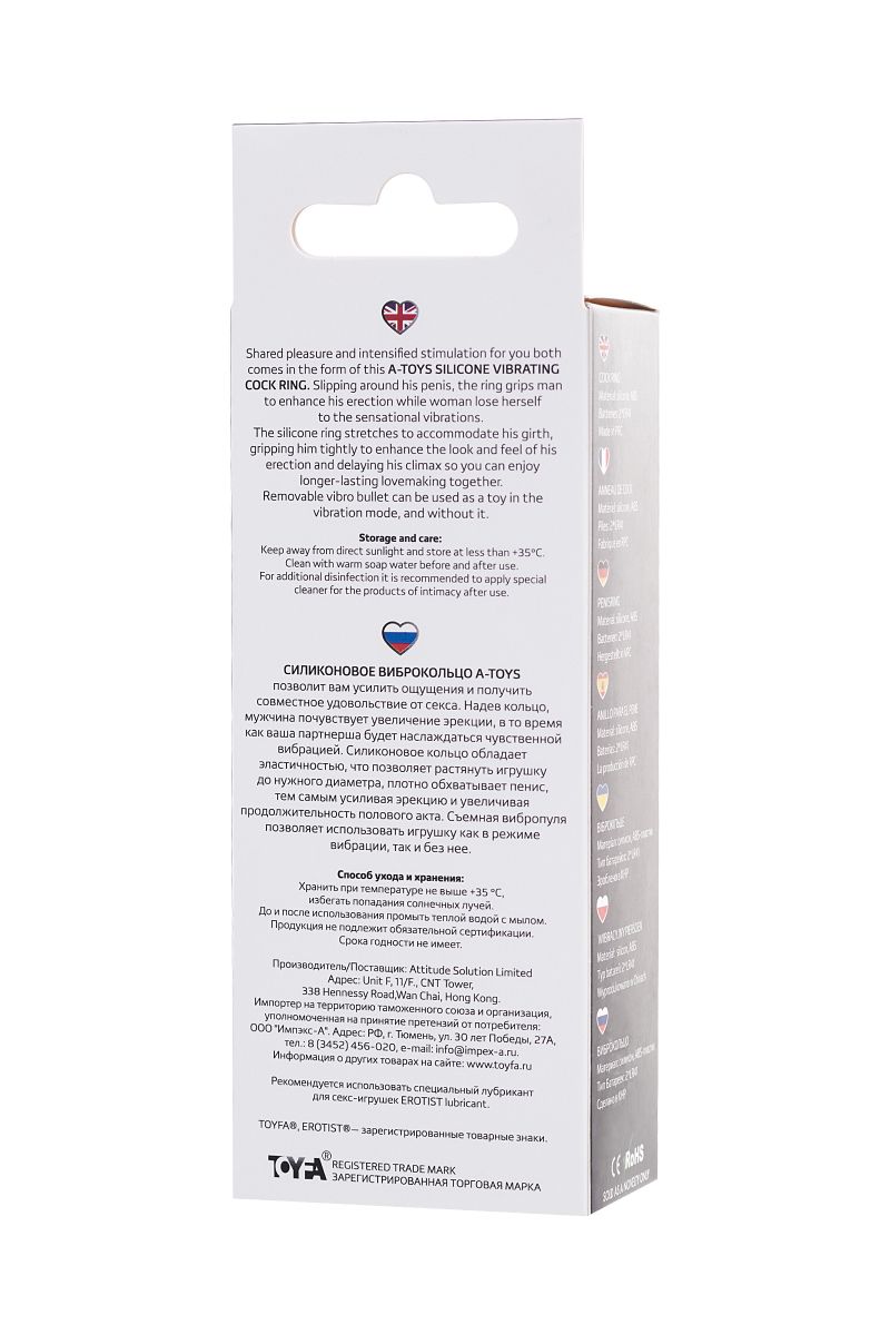 Силиконовое виброкольцо А-Toys позволит вам усилить ощущения и получить совместное удовольствие от секса. Надев кольцо, мужчина почувствует увеличение эрекции, в то время как ваша партнерша будет наслаждаться чувственной вибрацией. Силиконовое кольцо обладает эластичностью, что позволяет растянуть игрушку до нужного диаметра, плотно обхватывает пенис, тем самым усиливая эрекцию и увеличивая продолжительность полового акта. Съемная вибропуля позволяет использовать игрушку как в режиме вибрации, так и без нее.