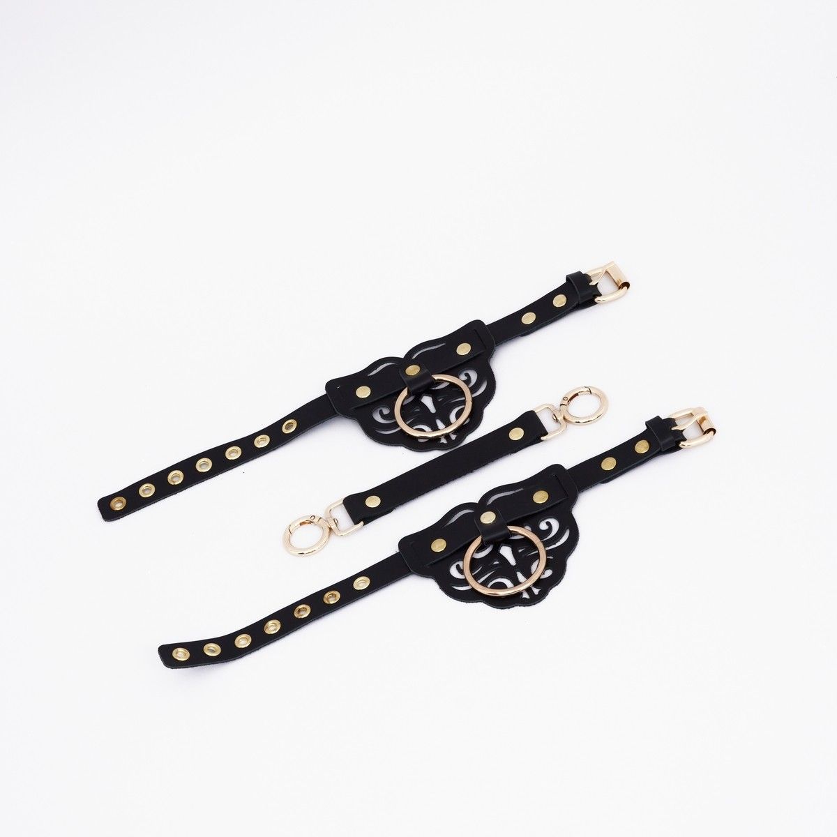 Оковы с декоративными резными узорами изготовлены из натуральной кожи. Декорированы золотой фурнитурой и клепками. В комплект также входит соединительный кожаный элемент с двумя карабинами, с помощью которого можно зафиксировать между…
