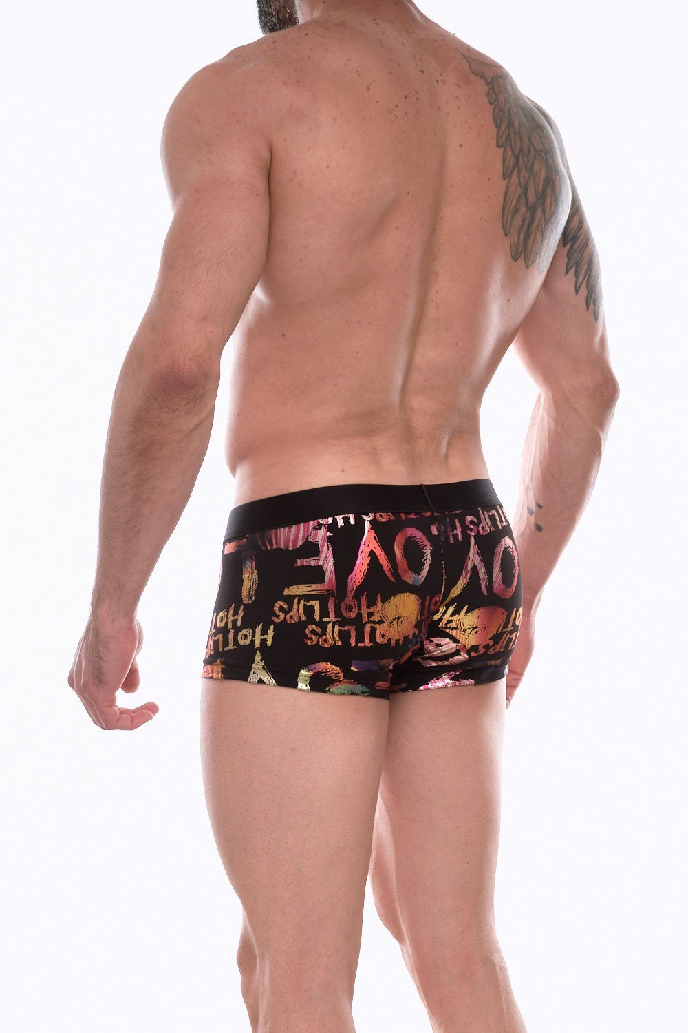 Черные трусы-боксеры с разноцветным блестящим принтом.