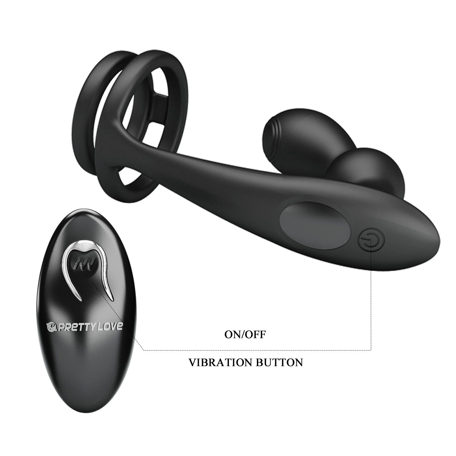Черный вибростимулятор простаты с фиксацией кольцами. 12 режимов вибрации. Пульт дистанционного управления в комплекте. Рабочая длина – 7,5 см. Диаметр колец – 3,8 и 4,7 см.