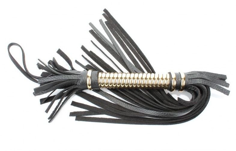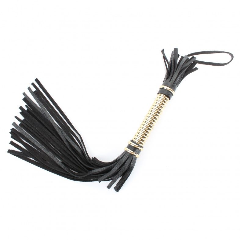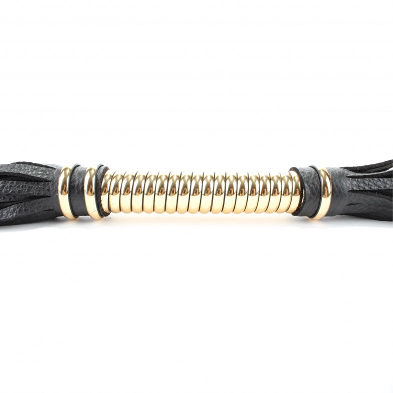 Плеть выполнена из натуральной кожи черного цвета. Стильная витая металлическая рукоятка золотого цвета и мягкие хвосты аксессуара доставят незабываемое впечатление, позволят партнерам воплотить самые сокровенные желания. Для удобства на верхней части рукоятки расположена петелька. Количество хвостов – 20 штук. Длина рукояти – 16 см.
