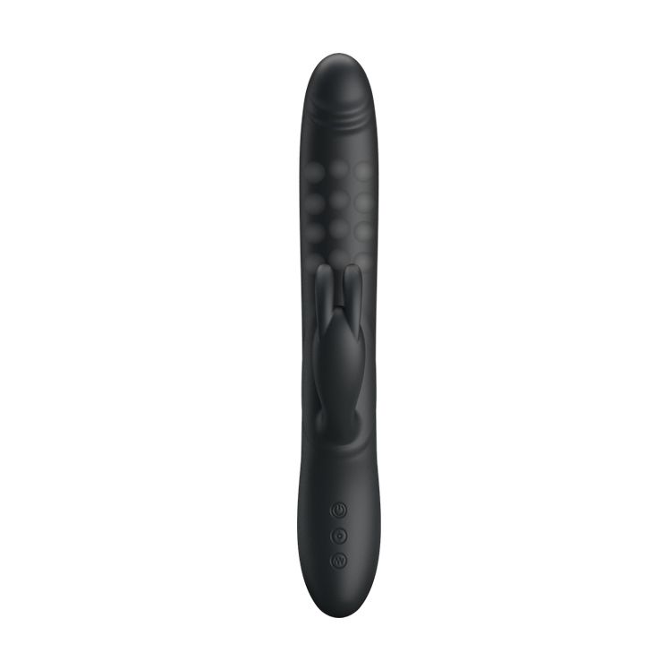 Черный вибратор с функциями вращения ствола и мощным клиторальным стимулятором в форме зайчика с 7 режимами вибрации и 4 режимами ротации (регулируются кнопками на основании). Вращение осуществляется при помощи металлических шариков , расположенных внутри изделия. Имеется возможность менять направление вращения. Водонепроницаемый. Рабочая длина – 16 см.