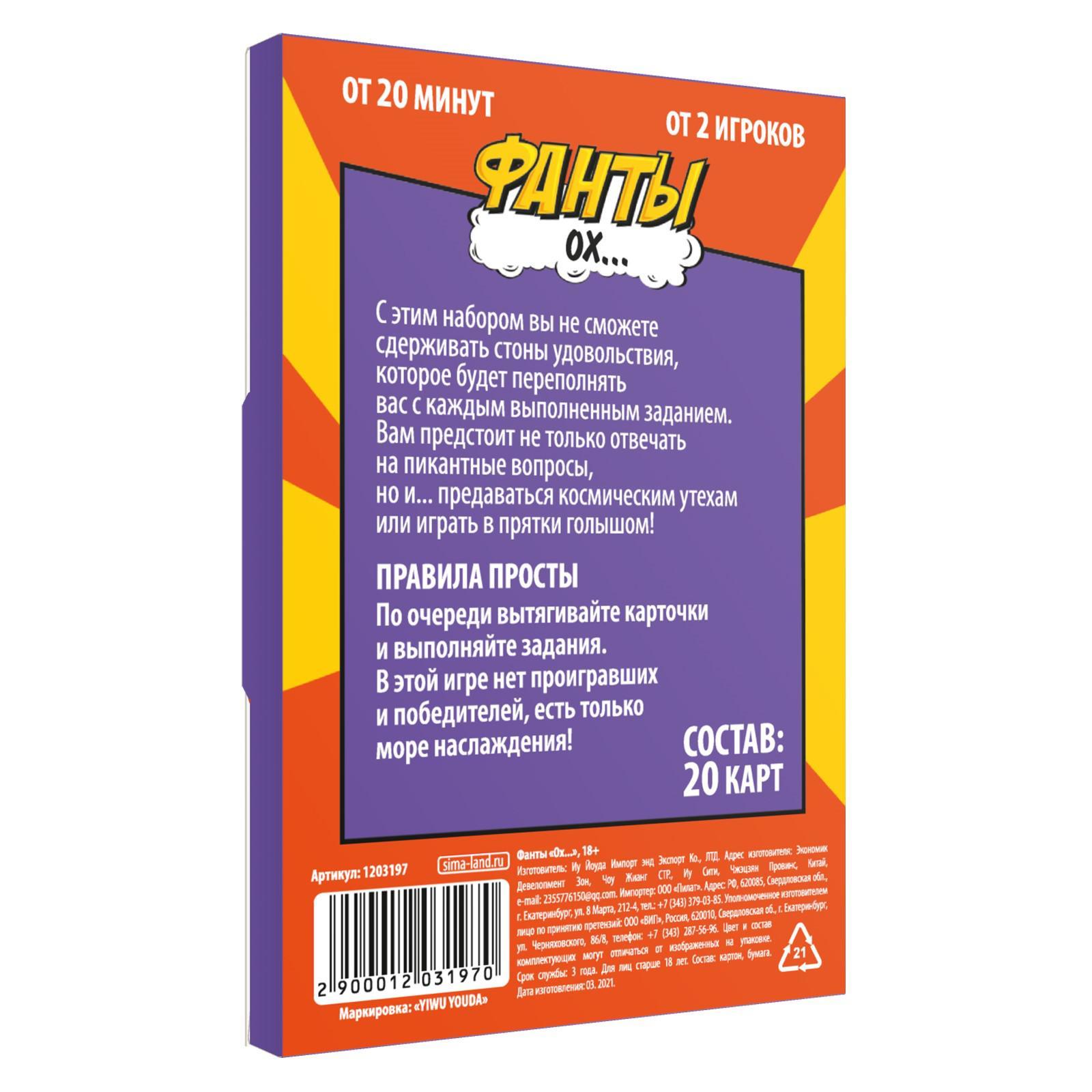 Ах… ох… чувствуете? Это стоны наслаждения, которые больше нельзя сдерживать. Перед вами набор фантов с заданиями для двоих. Порадуйте партнёра, предавшись удивительным занятиям в постели. Но не забудьте добавить в сегодняшний вечер долю юмора, а в этом помогут «Ох…» фанты. Всё, что требуется, это открыть набор фантов и по очереди выполнять задания с карточек. В игре нет победителей, ведь о каком выигрыше может идти речь, когда вас и партнёра закружило в вихре удовольствия? Окунитесь в омут страсти вместе с этими волнующими фантами. В комплекте: 20 карточек с фантами.