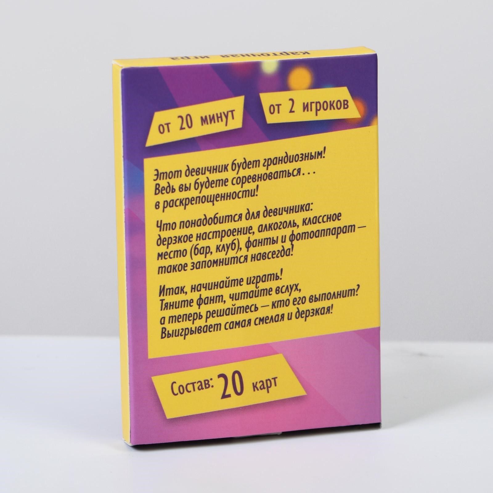 Собираетесь с подругами зажечь на свадьбе или вечеринке? Пусть все вокруг лопнут от зависти, ведь перед вами уникальный набор фантов, который сделает праздник незабываемым. Обязательно возьмите фотоаппарат — о вашем веселье будут ходить легенды! Вам предстоит… продемонстрировать все секреты обольщения незнакомцев, исполнять грязные танцы и выполнять другие провокационные задания. Для начала поставьте что-нибудь на кон — добавьте азарта! Например, выигравшая девушка получает букет невесты. Играть очень просто: вытягивайте фанты, зачитывайте задания и определяйтесь, кто возьмётся его выполнять. Справились с задачей? Забирайте карточку. Победит самая смелая и дерзкая: только у неё получится собрать больше всего карт!