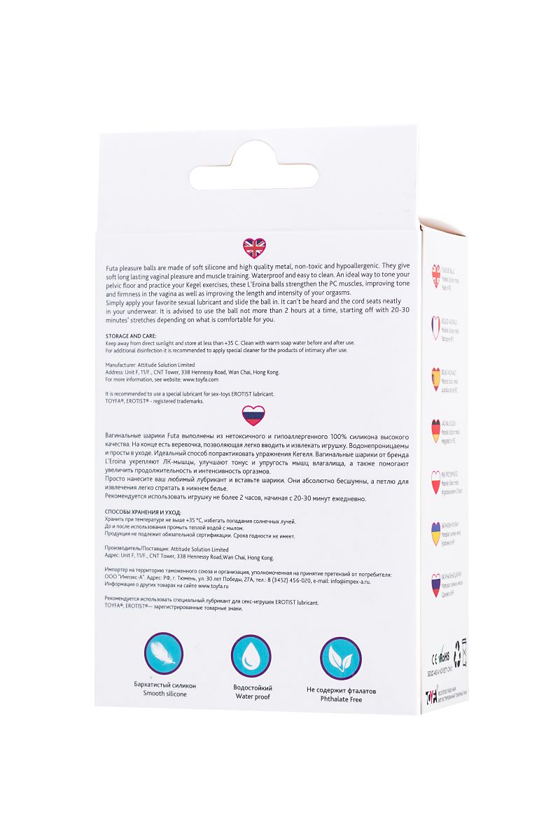 Вагинальные шарики Futa выполнены из нетоксичного и гипоаллергенного 100% силикона высокого качества. На конце есть веревочка, позволяющая легко вводить и извлекать игрушку. Водонепроницаемы и просты в уходе. Идеальный способ попрактиковать упражнения Кегеля. Вагинальные шарики от бренда L’Eroina укрепляют ЛК-мышцы, улучшает тонус и упругость мышц влагалища, а также помогают увеличить продолжительность и интенсивность оргазмов. Просто нанесите ваш любимый лубрикант и вставьте шарики. Они абсолютно бесшумны, а петлю для извлечения легко спрятать в нижнем белье. Рекомендуется использовать игрушку не более 2 часов, начиная с 20-30 минут ежедневно. Рабочая длина – 6 см. Вес – 63 гр.