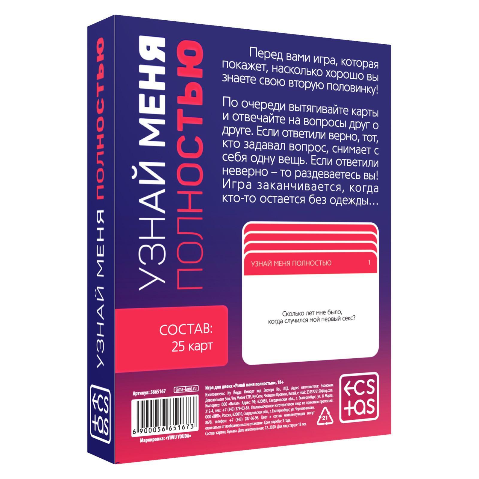 Узнайте друг друга с новой стороны! Игра покажет, как хорошо вы знаете свою вторую половинку! По очереди вытягивайте карты и отвечайте на вопросы друг о друге. Если вы ответили верно, то тот, кто задавал вопрос, снимает с себя одну вещь. Если ответили неверно, то раздеваетесь вы! Игра заканчивается, когда кто-то из вас останется без одежды. В комплекте: 25 карт.