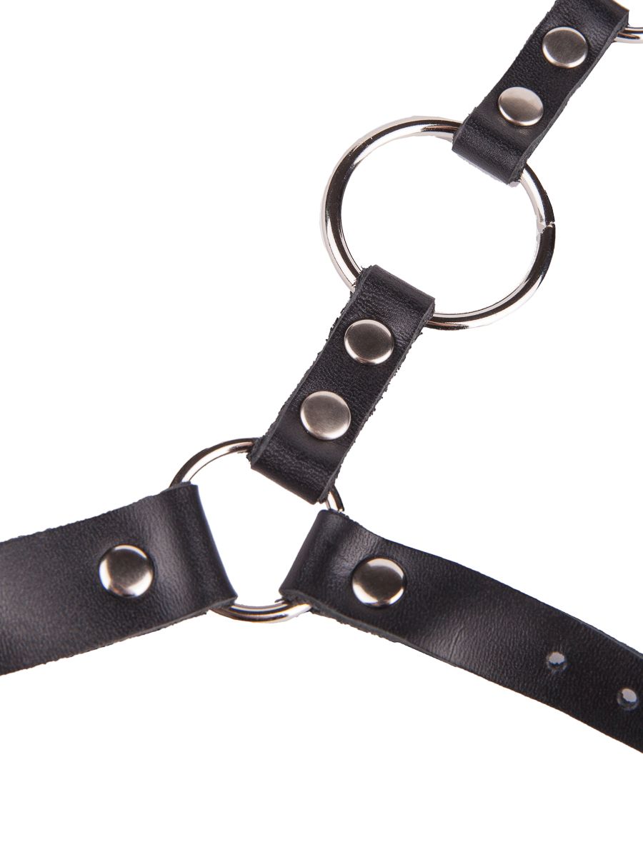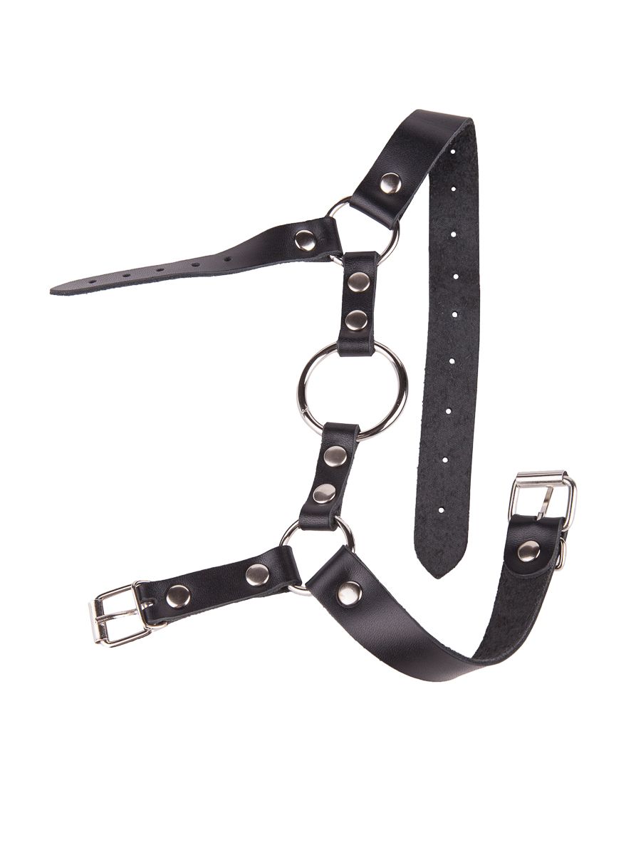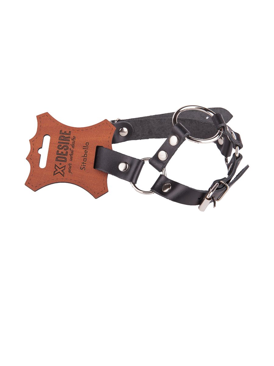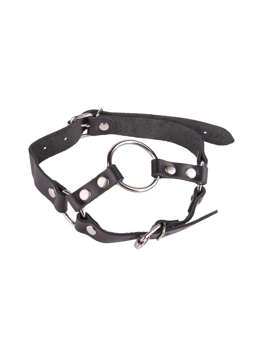 Кляп-кольцо на чёрных кожаных ремешках с застёжкой. Внешний диаметр кольца 44 мм.