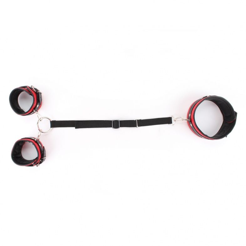 Набор фиксаторов из ошейника соединенного с наручниками с помощью ремешка из ранцевой ленты. Выполнен из натуральной кожи красного цвета с перфорацией, подклад из черной кожи. Ошейник подойдет на обхват от 27 до 38 см, наручники на обхват от 14 до 23 см. Длина ленты регулируется от 14 до 58 см, на одном ее конце находится карабин для ошейника, а на другом кольцо для крепления наручников. Ширина манжет и ошейника – 6 см. Ширина ленты – 2 см.