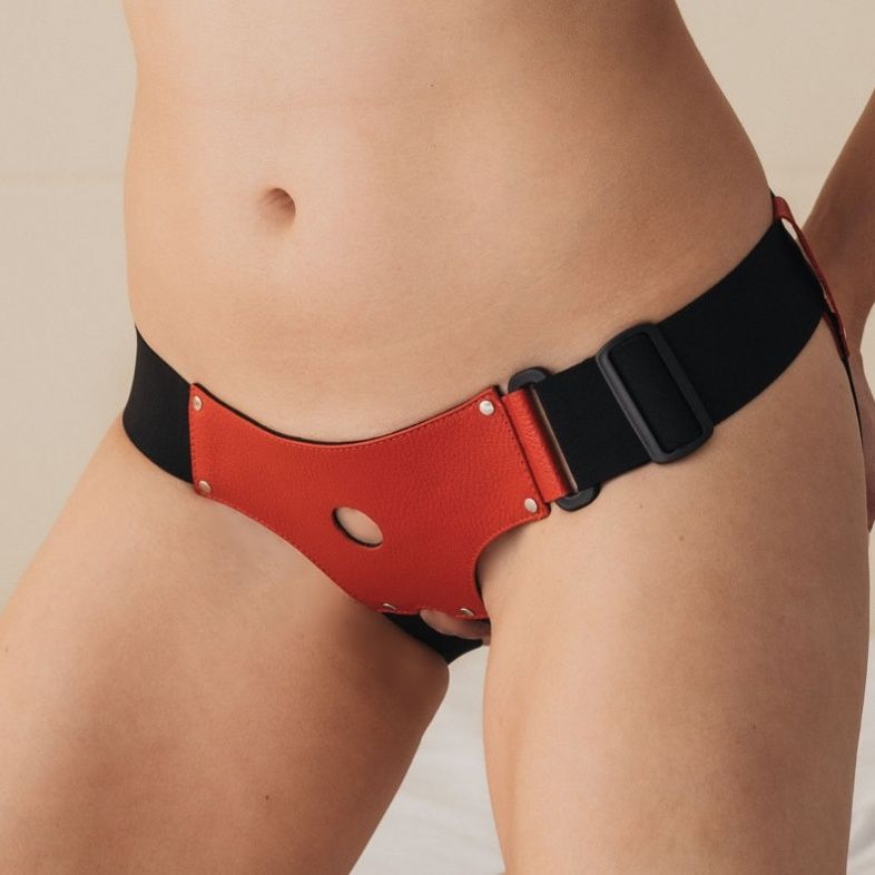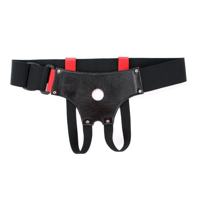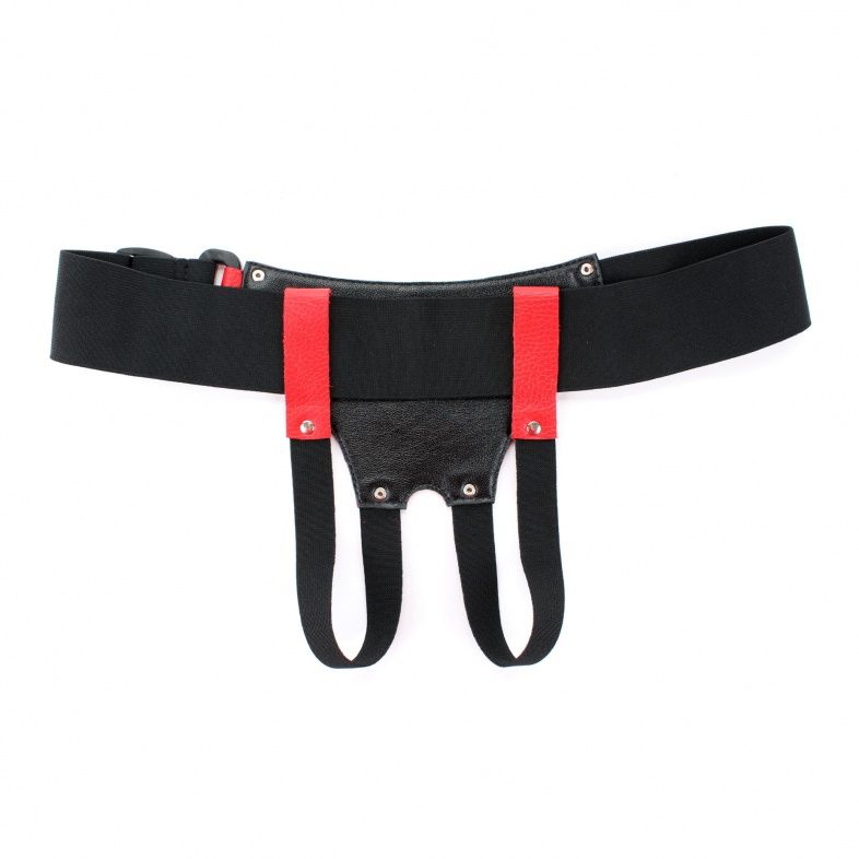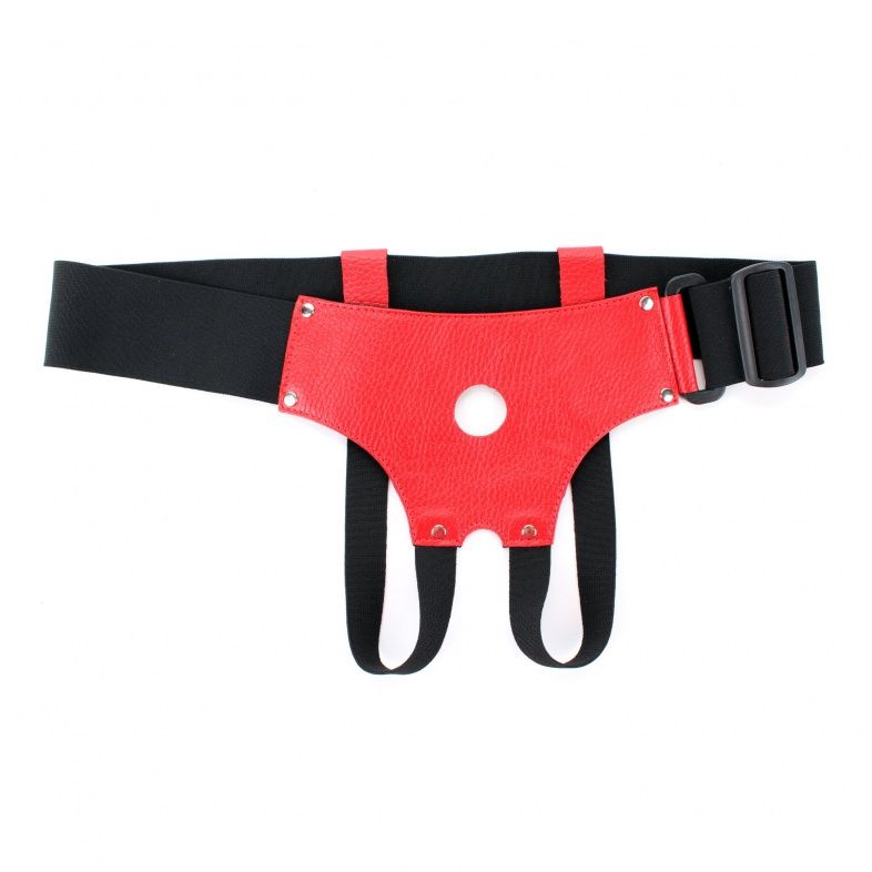 Трусики выполнены из натуральной кожи красного цвета с элементами из черных эластичных резинок, надежно фиксирующих изделие на теле. Трусики-джоки обеспечивают доступ к интимным зонам. Размер удобно регулируется, подойдет на 42-46. Максимально комфортный аксессуар разнообразит любую БДСМ игру. Ширина резинки на поясе – 5 см. Диаметр отверстия для страпона – 2,5 см.