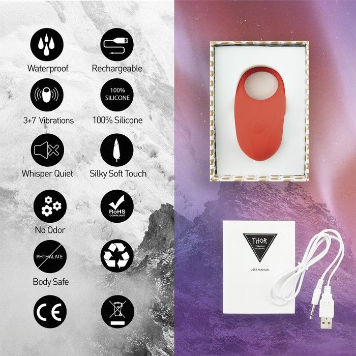 Водонепроницаемое вибрирующее кольцо для пениса красного цвета Thor от Feelztoys сделает мужскую эрекцию более продолжительной и сильной, за счет плотного обхвата полового член. Оно обладает сильными вибрациями и может использоваться как для одиночной игры, так и для пар. Для мужских соло-игр Вы можете носить эрекционное кольцо повернув его вибрирующим язычком вниз для стимуляции мошонки или во время парных игр – вверх, для стимуляции клитора женщины. Thor имеет 3 разные скорости и 7 разных паттернов вибрации, абсолютно не имеет запаха, с очень тихим мотором. Кольцо выполнено из шелковистого мягкого силикона и имеет идеальную форму, при полной зарядке оно проработает около двух часов.