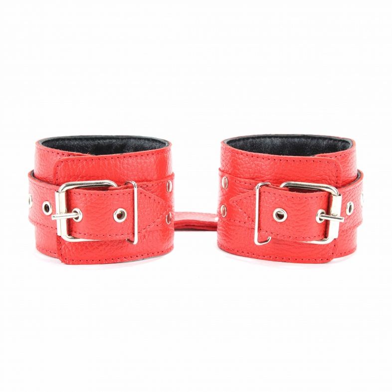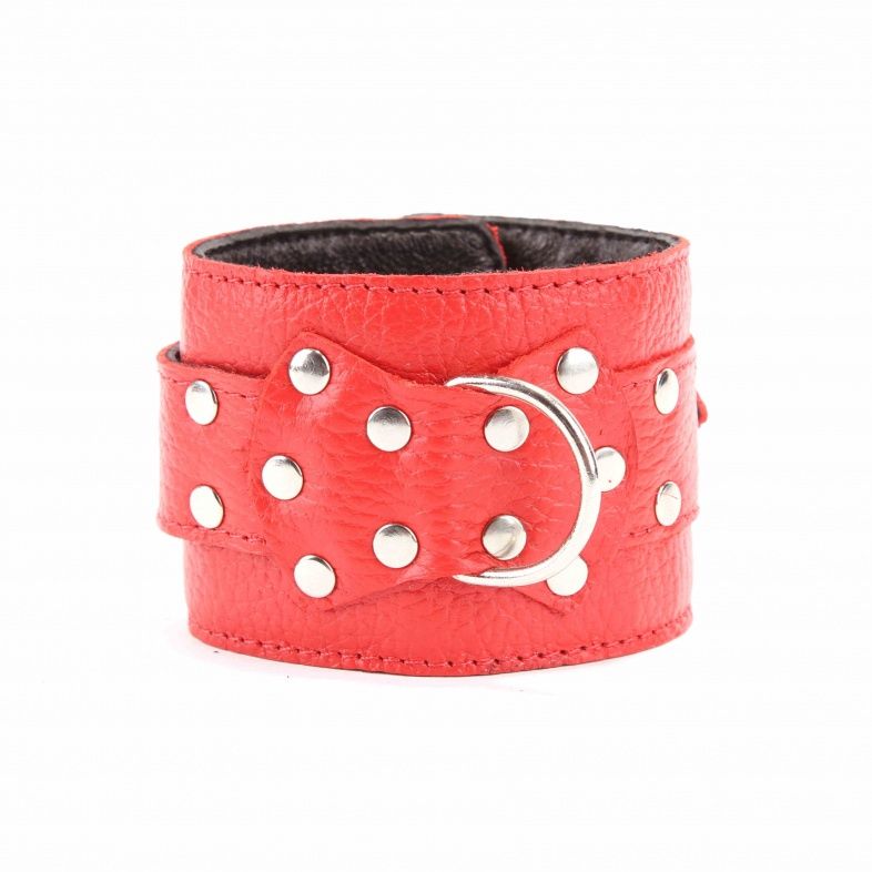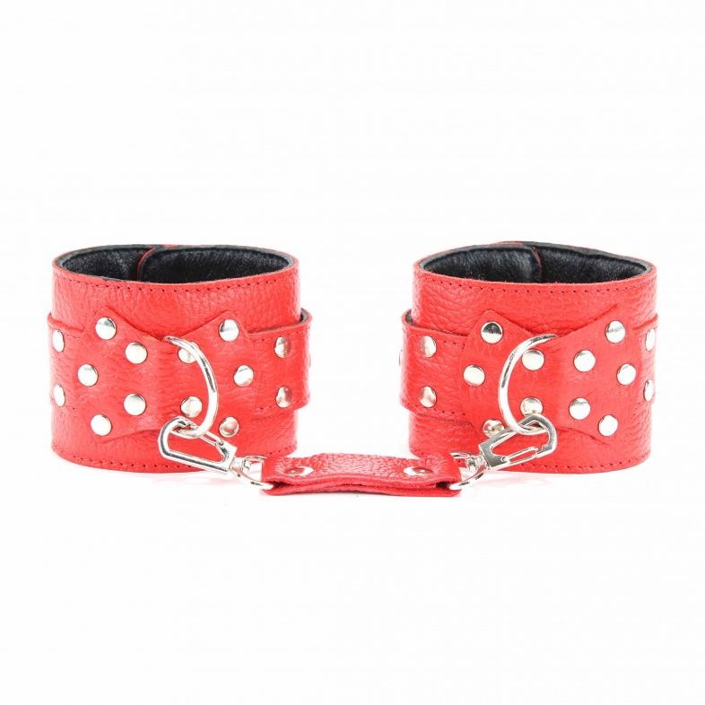 Наручники выполнены из натуральной кожи красного цвета. Декорированы заклепками и бантом с металлическим кольцом. Наручники надежно фиксируются пряжками и ремнями, позволяющими выбрать нужный размер, подойдут на обхват руки от 16…