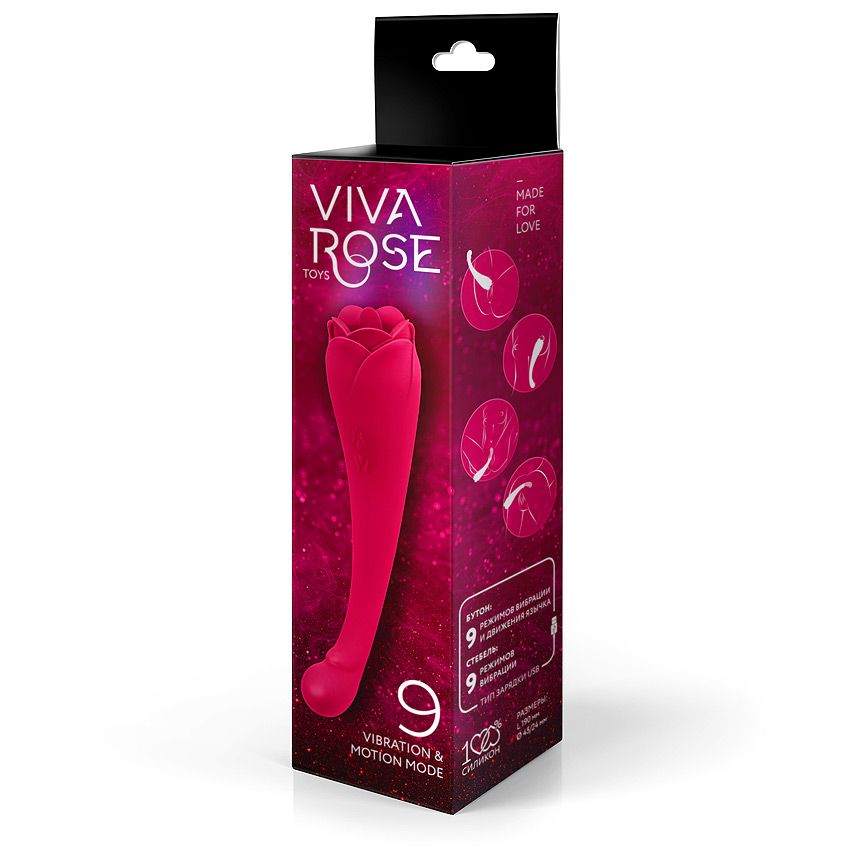 Оригинальный вибромассажёр для стимуляции влагалища, клитора, сосков и других эрогенных зон. Изогнутый ствол секс-игрушки имеет выпуклость, позволяющую воздействовать на точку G. Внутри находится виброэлемент, создающий вибрацию по всей длине интимного аксессуара. Вибрация в стволе имеет 9 различных вариантов. Более широкая часть изделия в виде бутона розы оснащена небольшим язычком, который имитирует оральные ласки. Язычок вибрирует и движется в 9 разных направлениях. Вибрация в стволе и язычок могут работать как одновременно, так и по-отдельности. Вкл./выкл. вибрации — нажать и 3 сек. удерживать соответствующую кнопку на корпусе изделия. Должен загореться/погаснуть световой индикатор. Переключение виброрежимов — краткое нажатие той же кнопки. Вкл./выкл. работы язычка — нажать и 3 сек. удерживать соответствующую кнопку на корпусе изделия. Должен загореться/погаснуть световой индикатор. Переключение режимов — краткое нажатие той же кнопки. Диаметр проникающей части – 2,4 см.