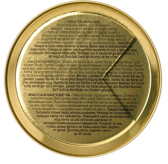 Создайте атмосферу романтического прикосновения. Зажгите свечу, и наполните комнату возбуждающим запахом афродизиаков. Погасите пламя, затем нанесите образовавшееся теплое (но не горячее!) масло на тело массажными движениями и ощущение блаженства вам обеспечено. Два в одном: ароматизированная свеча и массажное масло. • Изготовлено из 100% натуральных масел • При горении свечи образуется теплое массажное масло, не обжигающее кожу • Делает кожу мягкой и шелковистой • Великолепный смягчитель • Длительность горения свечи – до 7 часов • Нежные и тонкие ароматы, обволакивающие тело и комнату. Эта свеча из соевого масла не содержит парафина, а значит, не содержит никаких токсичных веществ. Соевое, кокосовое и миндальное масла смягчают и ухаживают за кожей, не закупоривают поры и подходят для любого типа кожи. Ресурс – 7 часов горения.