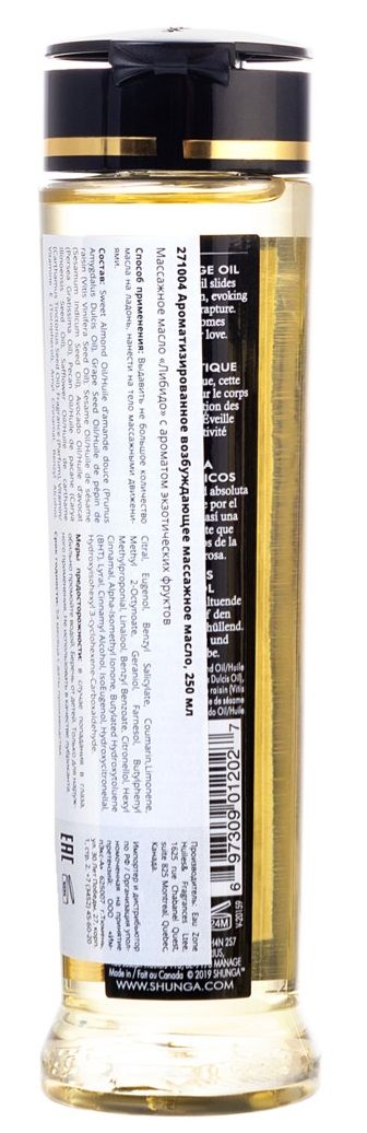 Несъедобное массажное масло Shunga Erotic Massage Oil с ароматом экзотических фруктов. 100% натуральные масла холодного отжима. Витамин Е (антиоксидант). Без жирных следов на коже. Не забивает поры. Нет минерального или животного масла в составе. Масло легко скользит по коже, в то время как экзотические ароматы поднимут ваши чувства до вершин возбуждения… Идеально подходит для того, чтобы насладиться расслабляющим массажем. Это на 100 % натуральное масло с упоительными ароматами, легко скользит по коже, не оставляя жирной пленки.