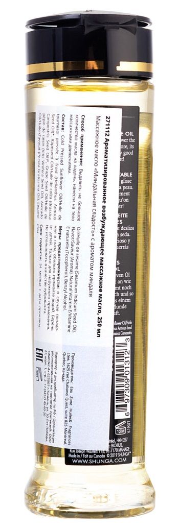 Массажное масло Almond Sweetness с ароматом миндаля. Чувственное удовольствие прикосновения и невероятно волнующий аромат накаляют вашу близость с этим сочным маслом Shunga Kissable Massage Oil, которое скользит по коже, как шелк. Смесь сертифицированных органических растительных масел. Натуральная добавка – миндаль. Натуральное и съедобное. Усильте удовольствие и ощущения эрогенных зон вашего партнера… Кроме того, оно абсолютно безопасно, благодаря натуральным компонентам, входящим в его состав!