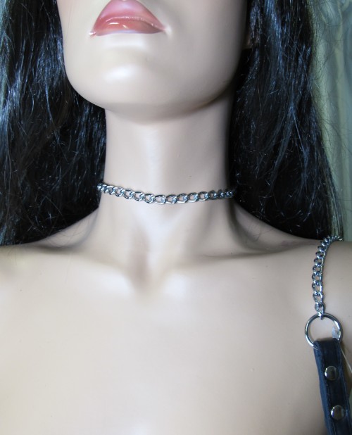 Поводок изготовлен из натуральной кожи. При изготовлении использована фурнитура с никелевым покрытием. Металлическая цепочка (поводок), с карабином на конце, поможет вам с лёгкостью управлять своим партнёром. Длина цепочки – 85 см., ширина – 0,5 см.