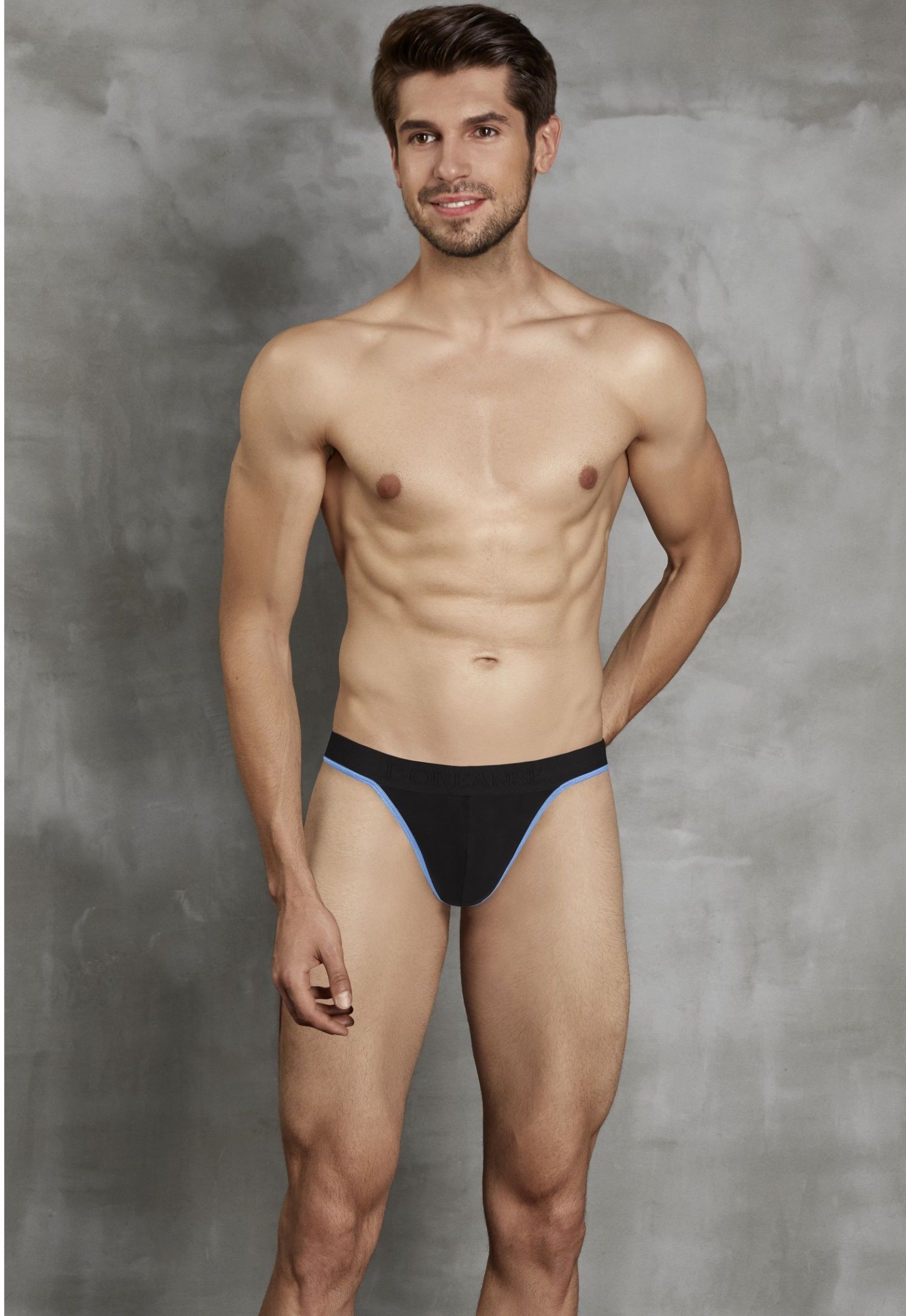 Мужские стринги на пришивной резинке от «Doreanse». Края передней панели, низ пришивной резинки и задняя лямочка украшены контрастным эластичным кантом. Передняя панель однослойная, без подкладки.
