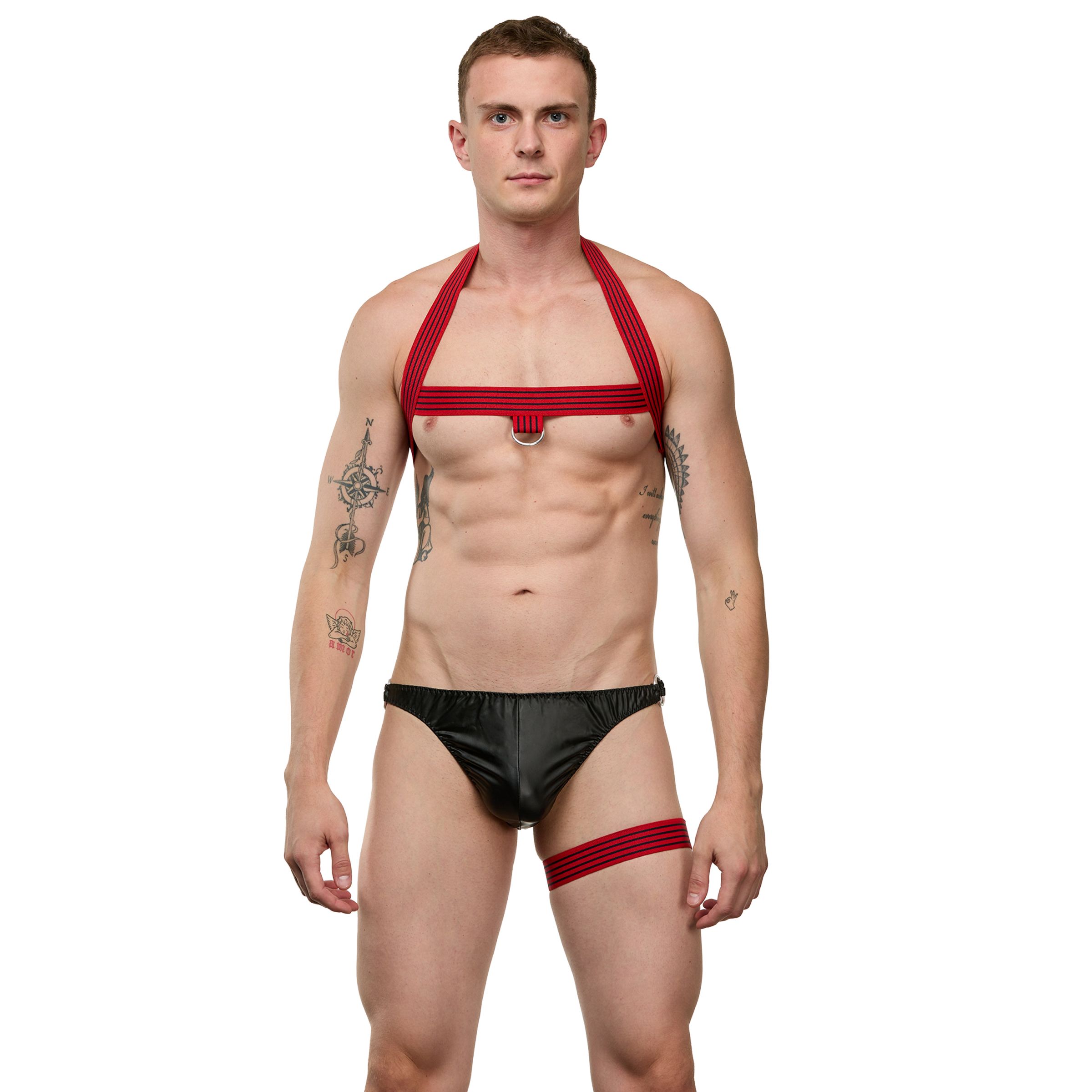 Мужской костюм «Танцор». Выполнен в черно-красном цвете и состоит из 3 предметов. В комплекте: трусы-тонги, подвязка на ногу, портупея.