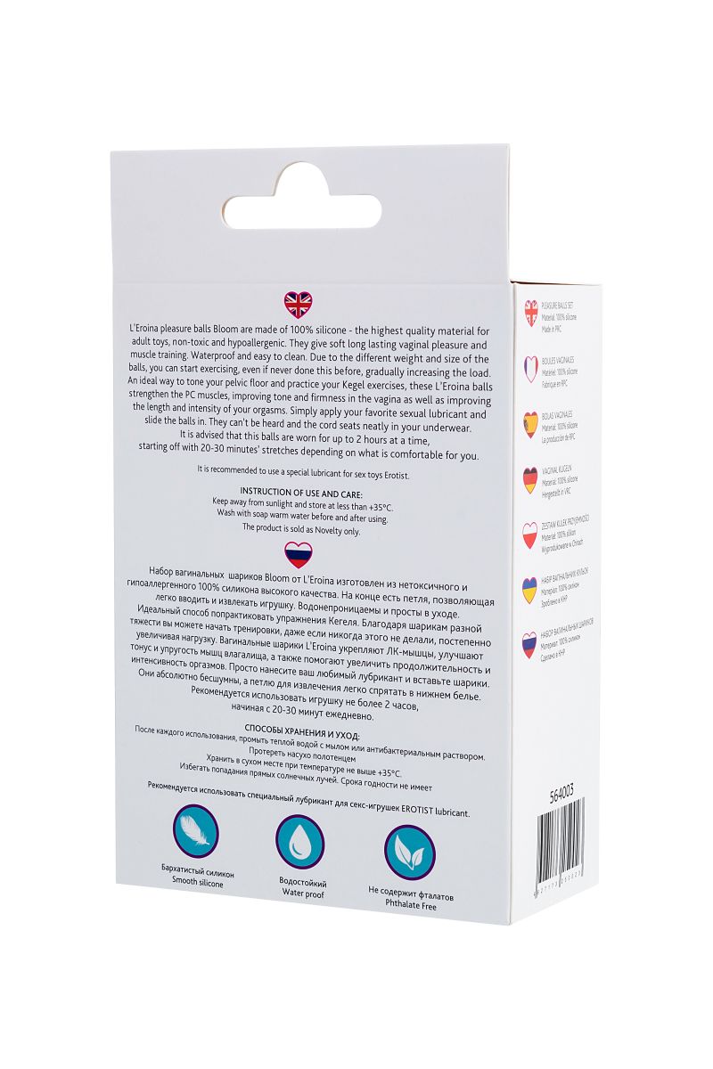 Набор вагинальных шариков Bloom от LEroina изготовлен из нетоксичного и гипоаллергенного 100% силикона высокого качества. На конце есть петля, позволяющая легко вводить и извлекать игрушку. Водонепроницаемы и просты в уходе. Идеальный способ попрактиковать упражнения Кегеля. Благодаря шарикам разной тяжести вы можете начать тренировки, даже если никогда этого не делали, постепенно увеличивая нагрузку. Вагинальные шарики LEroina укрепляют ЛК-мышцы, улучшают тонус и упругость мышц влагалища, а также помогают увеличить продолжительность и интенсивность оргазмов. Они абсолютно бесшумны, а петлю для извлечения легко спрятать в нижнем белье. Рекомендуется использовать игрушку не более 2 часов, начиная с 20-30 минут ежедневно. Длина большого шарика – 13,5 см., диаметр – 3,1 см. Длина среднего шарика – 10,5 см., диаметр – 3,1 см. Длина маленького шарика – 10,5 см., диаметр – 3,1 см.