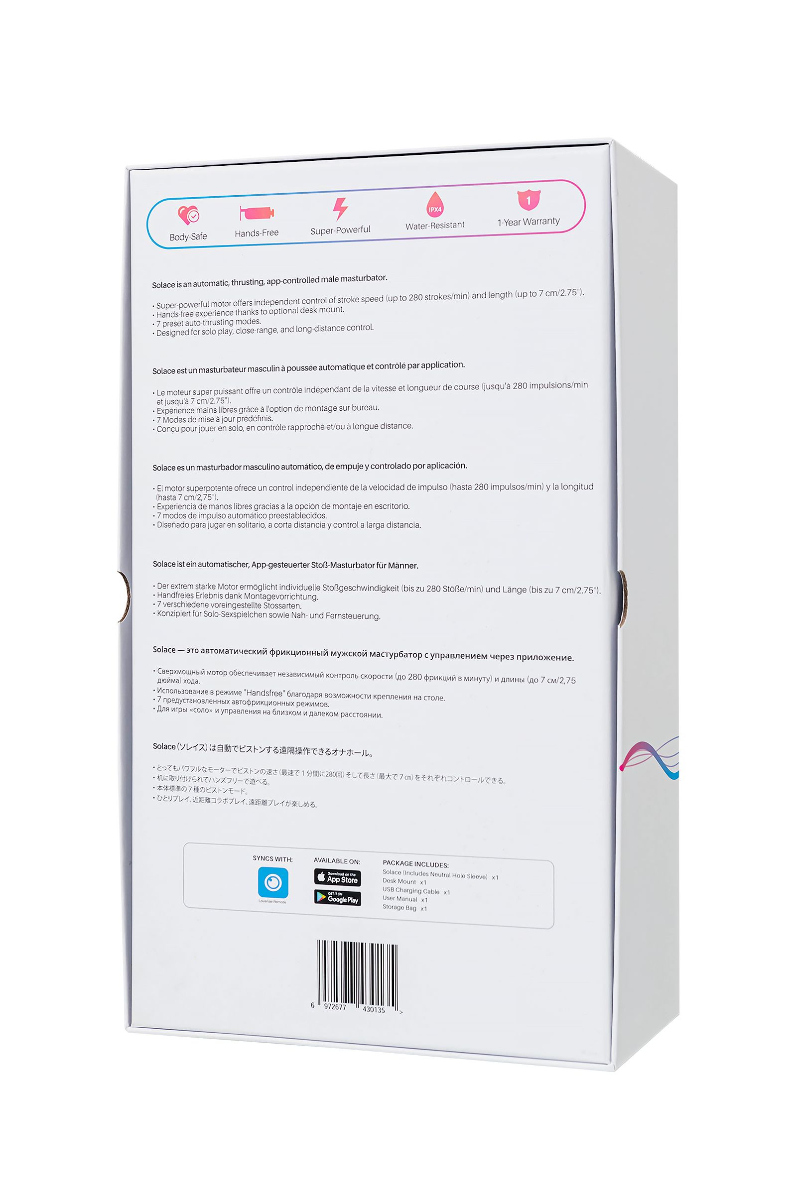 Вы готовы возвести вашу мастурбацию на новый уровень? Solace от Lovense – инновационный автоматический фрикционный мужской мастурбатор, который сделает “это” за тебя. Для этой игрушки не важен опыт и наличие партнера – соло игра, секс с партнером на расстоянии или виртуальная реальность – возможно все! С этой умной игрушкой у вас есть возможность настроить мастурбацию в зависимости от настроения, предпочтений и ситуации. От чувственной и неторопливой, до интенсивной и агрессивной. Этот мощный мастурбатор способен достигать до 280 ударов в минуту с настраиваемой глубиной хода до 7 см. Испытайте полное погружение в виртуальную реальность. Синхронизация с видео, играми, стримами и другими игрушками позволит существенно расширить грани удовольствия. Solace соответствует движениям стримера или персонажа в игре, в то время пока вы просто получаете удовольствие. Устойчивое настольное крепление удерживает Solace на месте и регулируется в пределах 180° в зависимости от того, как вы хотите играть – сидя за компьютером или стоя за столом. Мастурбатор легко использовать и без крепления – на диване, лежа в кровати или передав устройство партнеру. Управление простое и интуитивно понятное. Предустановленные 7 режимов переключаются кнопками на корпусе, а через приложение Lovense Remote вы можете создавать индивидуальные настройки. Solace предлагает неограниченное количество паттернов фрикций, регулируемые уровни скоростей и режимов, а также возможность игры в режиме Handsfree. Передайте контроль над Solace звуку, музыке или своему партнеру, создавая интенсивность и продолжительность фрикций по вашему вкусу. Lovense не терпит ограничений в удовольствии. Для вас предусмотрено неограниченное количество возможностей в соло режиме или даже находясь на большом расстоянии от партнера. В комплекте эластичный рукав с внутренней текстурой, созданной для того, чтобы тесно облегать пенис и усиливать каждое ощущение. Нейтральный рукав мягкий и гладкий, с ощущением настоящей кожи. Имеет выступы для дополнительной стимуляции и подходит большинству мужчин. Рукав легко снимать и устанавливать после очистки благодаря откидному держателю. Внимание, мастурбатор Solace не предназначен для игр в воде. Очистке подлежит только внутренний съемный рукав.