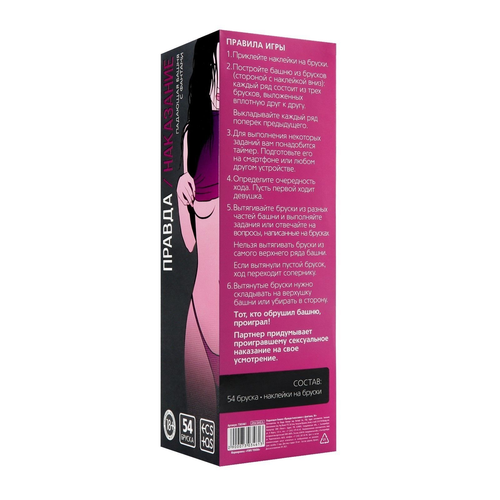 Правда или сексуальное наказание! Хотите провести время вдвоём, да ещё так, чтобы вечер прошёл незабываемо?Постройте башню из брусков. Вытягивайте бруски из разных частей башни и выполняйте задания или отвечайте на вопросы, написанные на брусках. Тот, кто обрушил башню, проиграл! Партнёр придумывает проигравшему сексуальное наказание на своё усмотрение. Внутри вы найдёте: 54 бруска из натурального дерева,наклейки с фантами на бруски. В комплекте: 54 бруска, наклейки с фантами.
