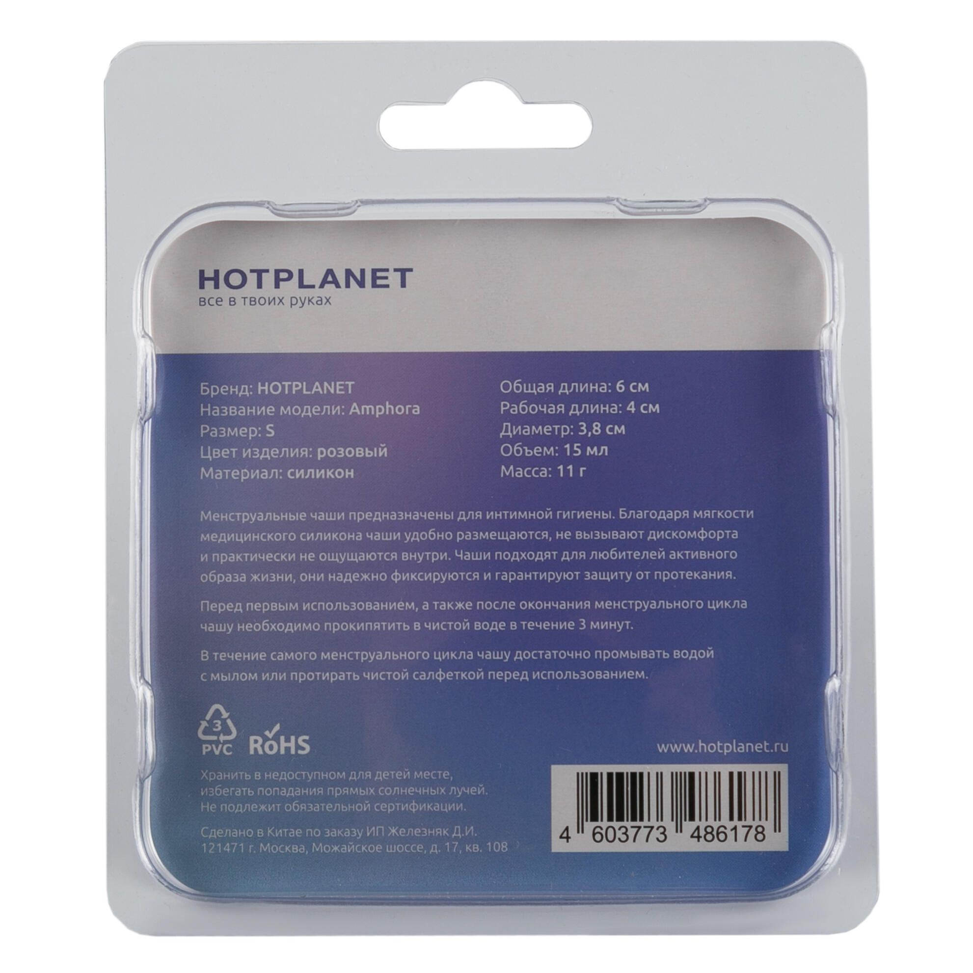 Hot Planet Amphora — менструальная чаша из мягкого медицинского силикона, гигиеничного и безопасного для здоровья. Чаша удобно размещается внутри и не вызывает никакого дискомфорта. Она абсолютно незаметна под любым бельем и совсем не ощущается. С Amphora вы можете заниматься спортом, плаванием, посещением спа и не бояться протеканий. В отличие от одноразовых средств гигиены, менструальная чаша не впитывает выделения, а собирает их. Благодаря этому, она безвредна для естественной микрофлоры и подходит для многоразового использования. При помощи удобного закругленного хвостика можно легко извлечь чашу после использования. Помимо удобства, менструальная чаша экологична и помогает экономить деньги, ведь при правильном уходе она служит годами, избавляя от необходимости покупать тампоны и прокладки. Менструальная чаша — единственное средство женской гигиены, которое позволяет отслеживать объемы кровопотери. Средняя кровопотеря в сутки составляет 50-70 мл (в норме до 80 мл), а кровопотеря за один менструальный цикл — не более 250 мл. Зная объем менструальной чаши, можно легко сравнить объемы потерянной крови с нормой и держать свое здоровье под контролем. Объем – 15 мл.