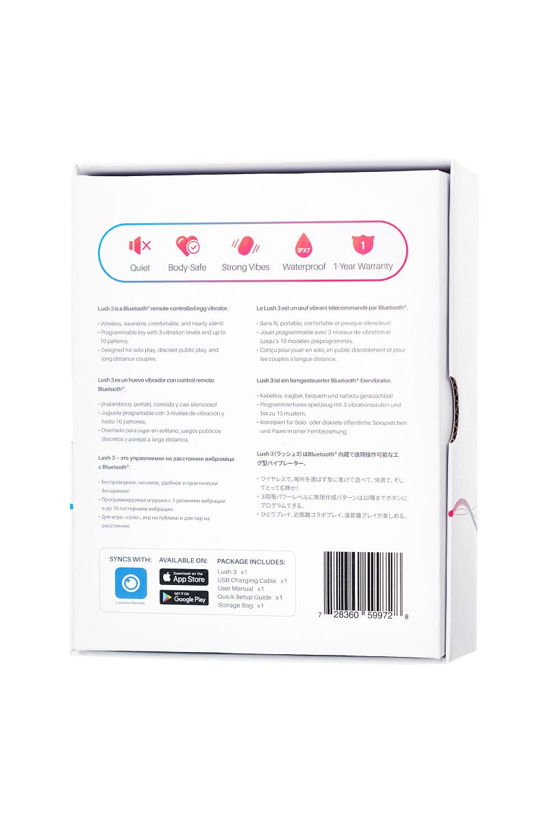 Lush 3 – это последняя версия всемирно известного виброяйца с дистанционным управлением с некоторыми существенными улучшениями, такими как фиксированный хвост, который обнимает тело и гарантирует, что игрушка будет оставаться в нужном месте и обеспечивать более глубокие вибрации на точке G, улучшенный аккумулятор и переработанная антенна Bluetooth. Рабочая длина – 7,6 см.