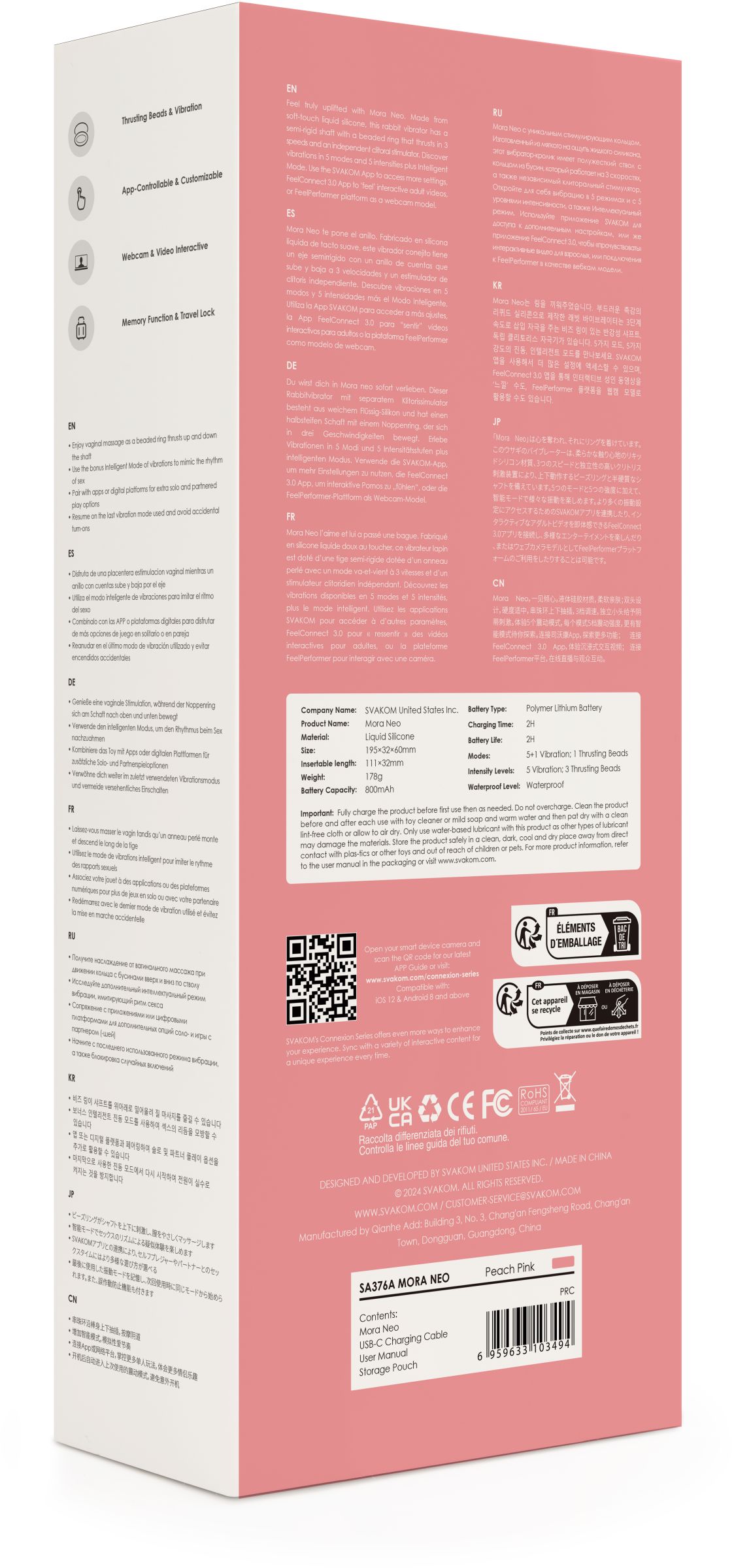 Изготовленный из мягкого на ощупь жидкого силикона, Mora Neo оснащен кольцом с бусинами, которое встроено в его полужесткий стержень, а также независимым стимулятором клитора. Проявите творческий подход, подключив Mora Neo к смартфону с поддержкой Bluetooth, а затем используйте приложение SVAKOM для настройки параметров или наслаждайтесь длительным управлением игрушкой или взаимодействием с партнером. В подвижное кольцо заложено 3 скорости движения шариков Mora Neo, а в стволе и клиторальном отростке также 5 режимов и 5 уровней интенсивности вибрации. Затем попробуйте бонусный интеллектуальный режим вибраций, имитирующий сексуальные ритмы. Mora Neo снабжена функцией памяти, которая возобновляет работу с последним использованным режимом вибрации, а также блокировкой кнопок для предотвращения случайных включений. Индикатор заряда батареи напомнит вам о необходимости подзарядки через USB-порт, имеющий пылезащитную крышку. Водонепроницаемая конструкция позволяет легко чистить и использовать ее в ванне или душе. Рабочая длина – 11 см.