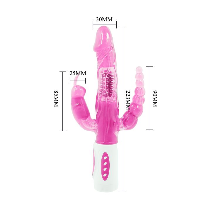 Розовый вибратор-ротатор с анальным и клиторальным стимуляторами – 22,3 см.