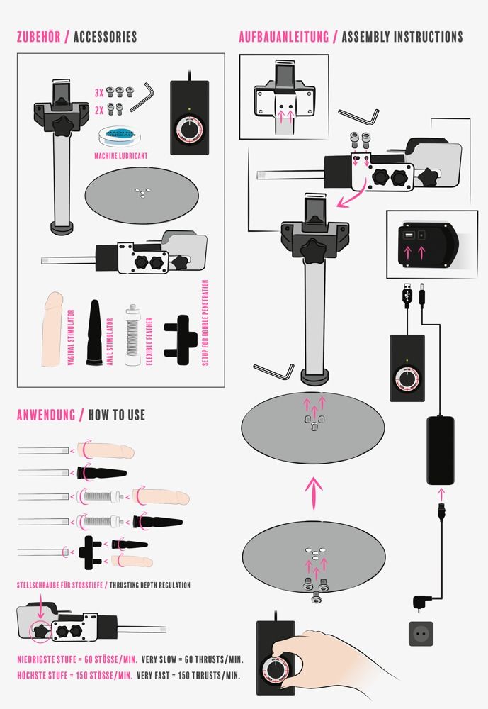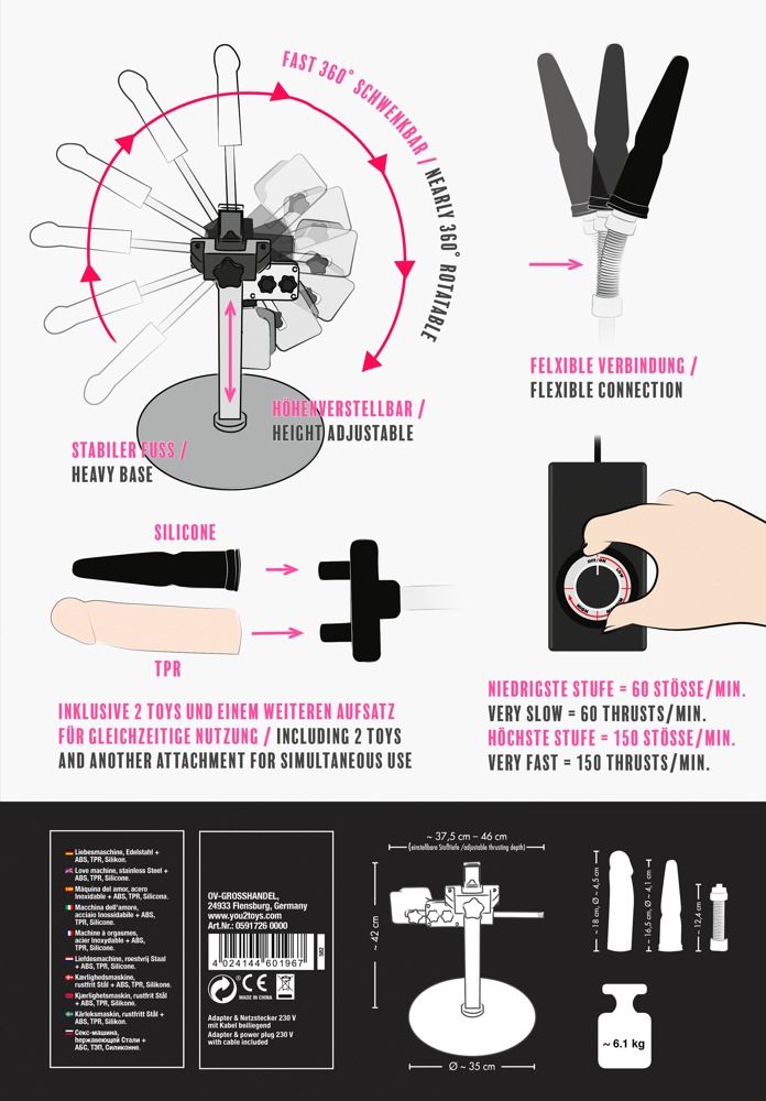 Работа в режиме свободные руки до 150 фрикций в минуту! Секс-машина с регулируемой по высоте стойкой и двумя насадками. С пультом дистанционного управления для регулирования и поворота до почти 360 градусов. Бесступенчатая регулировка достигает 150 фрикций в минуту, а глубина фрикций может регулироваться до 8 см. Предназначена для работы в режиме свободные руки и выполнена в современном дизайне. Кабель длиной 1,5 метра с штекером SchuKo типа F. В комплект поставки входит штекерное крепление для двойного проникновения. Длина вагинальной насадки – 18 см., диаметр – 4,5 см. Длина анальной насадки – 16,5 см., диаметр – 4,1 см.