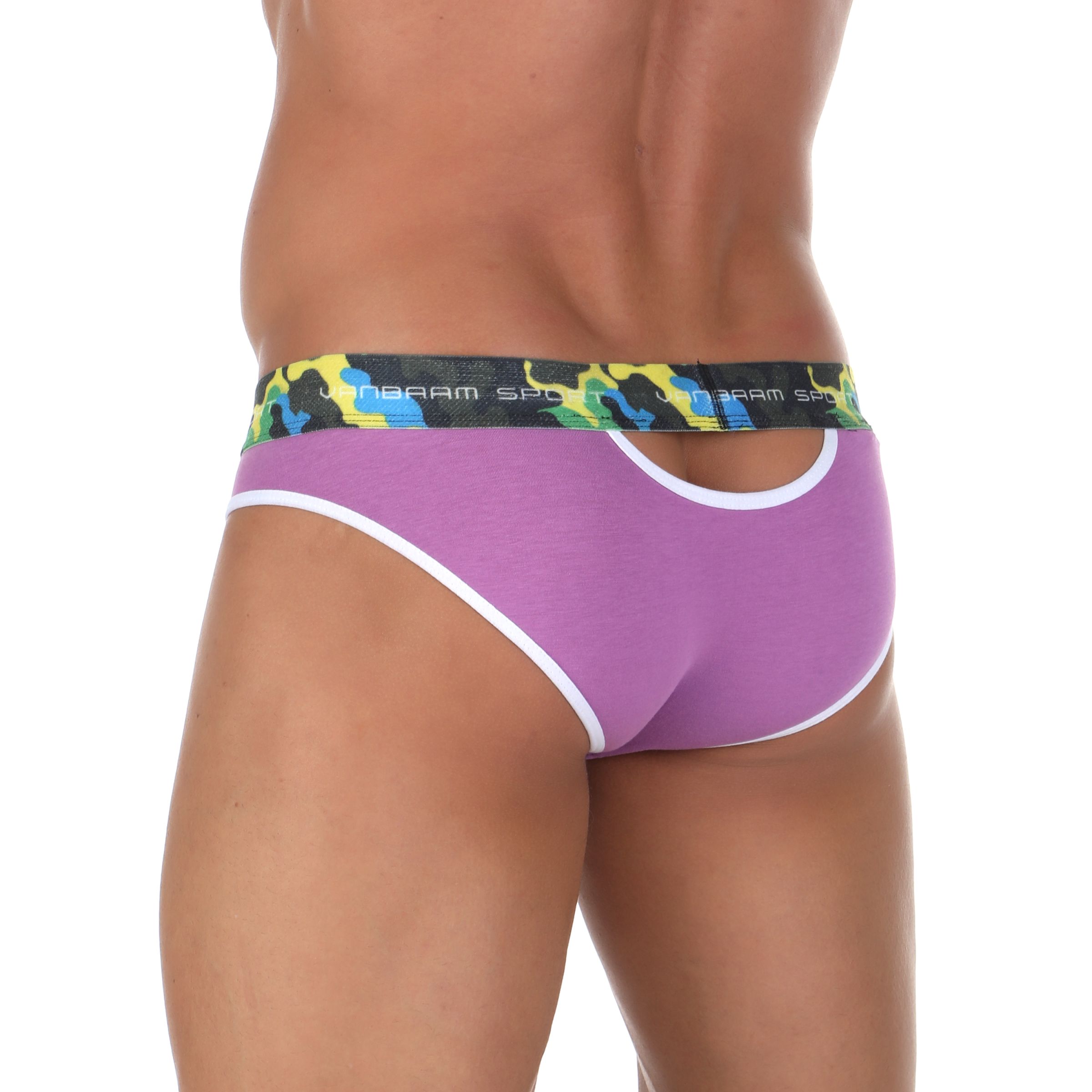 Сиреневые мужские трусы-слипы с пикантными вырезами под поясом.