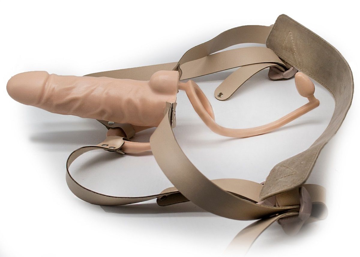 Анальный фиксатор и пустотелый фаллоимитатор для мужчин, с бандажом и ремешками. Самый трудный момент – это момент введение полового члена и преодоление секундного страха половой несостоятельности у мужчины. После введения фаллоса эрекция обычно нарастает, и даже появляется возможность полноценно завершить половой контакт. Введение полового члена возможно обеспечить в пустом эластичном каркасе. Эта основная идея, заложенная конструкторами. Каркас зафиксирован на поясе. Главное в этом изделии: для дополнительной стимуляции предстательной железы, что повышает вероятность стойкой эрекции, в этой конструкции предусмотрена дополнительная точка крепления за анус. Соединительная консоль (полипропиленовая изогнутая особым образом «палочка» с анальным коннектором в виде оливки) объединяет пустотелый фаллоимитатор, ремешки с бандажным поясом в единое целое для плотной, регулируемой, многоточечной фиксации на теле. Изделие имеет регулировки натяжения строп и, что очень важно – фастекс. Это расстегивающаяся пряжка позволяет мгновенно снять пояс и продолжить половой акт в естественном режиме. Если эрекция не достигает нужной величины, то страпон обеспечит всю продолжительность интимного контакта. Если в процессе близости возникает возможность продолжить секс без изделия, то его можно быстро снять. Рабочая длина – 14,5 см. Диаметр головки – 3,5 см.