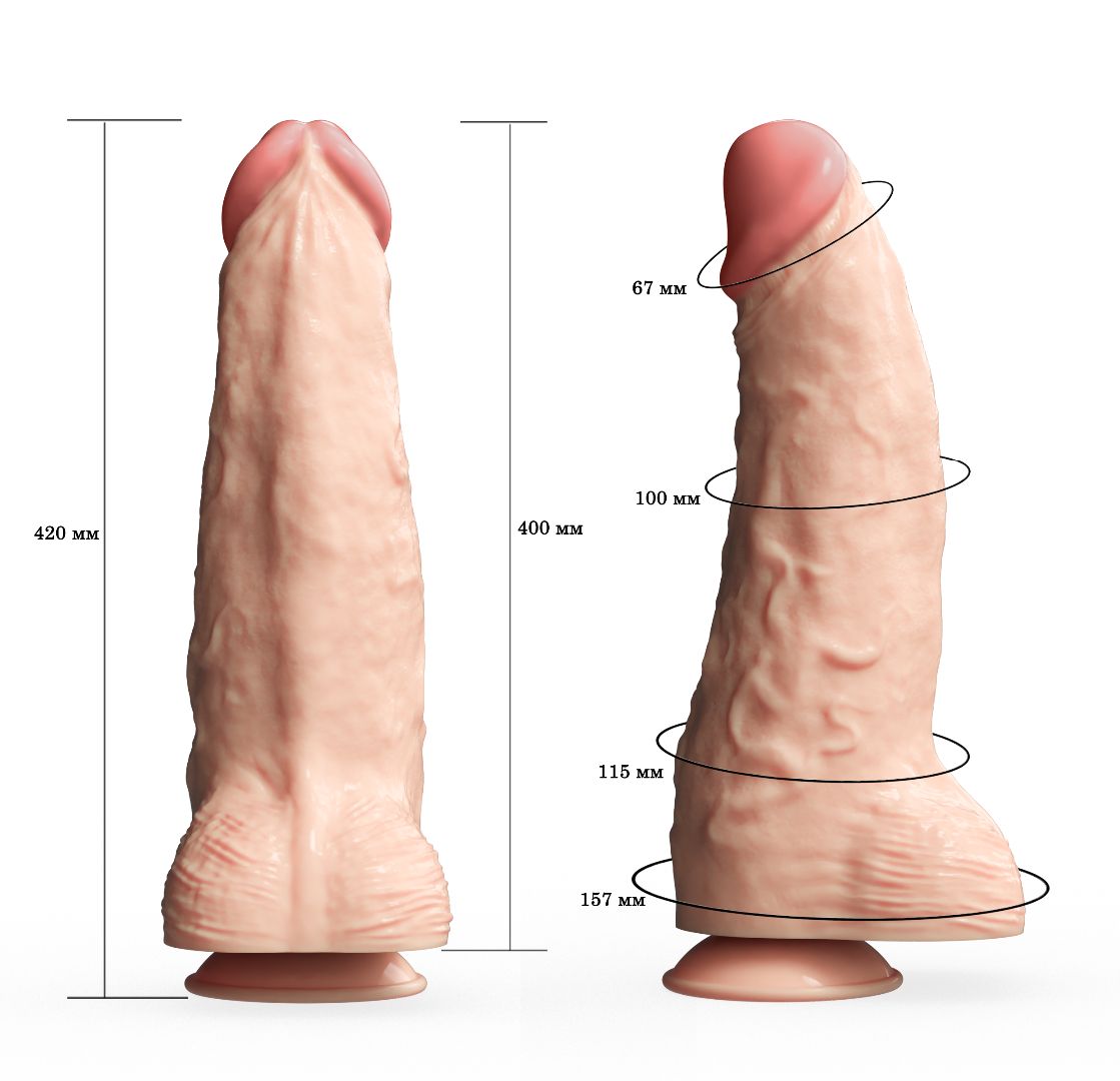 Искусственный фаллос гигантского размера. Фаллоимитатор из SEBS (TPR/TPI) и медицинского вазелинового масла. Изделие имеет многослойную структуру. Наружная оболочка сделана из мягкого материала NEOSKIN. Внутри каркас из более плотного, эластичного полимера. Фаллоимитатор полнотелый. Конусная форма с массивной нижней частью на мощной присоске. Головка относительно пропорций изделия уменьшена. Рабочая длина – 33 см. Диаметр головки – 6,7 см.