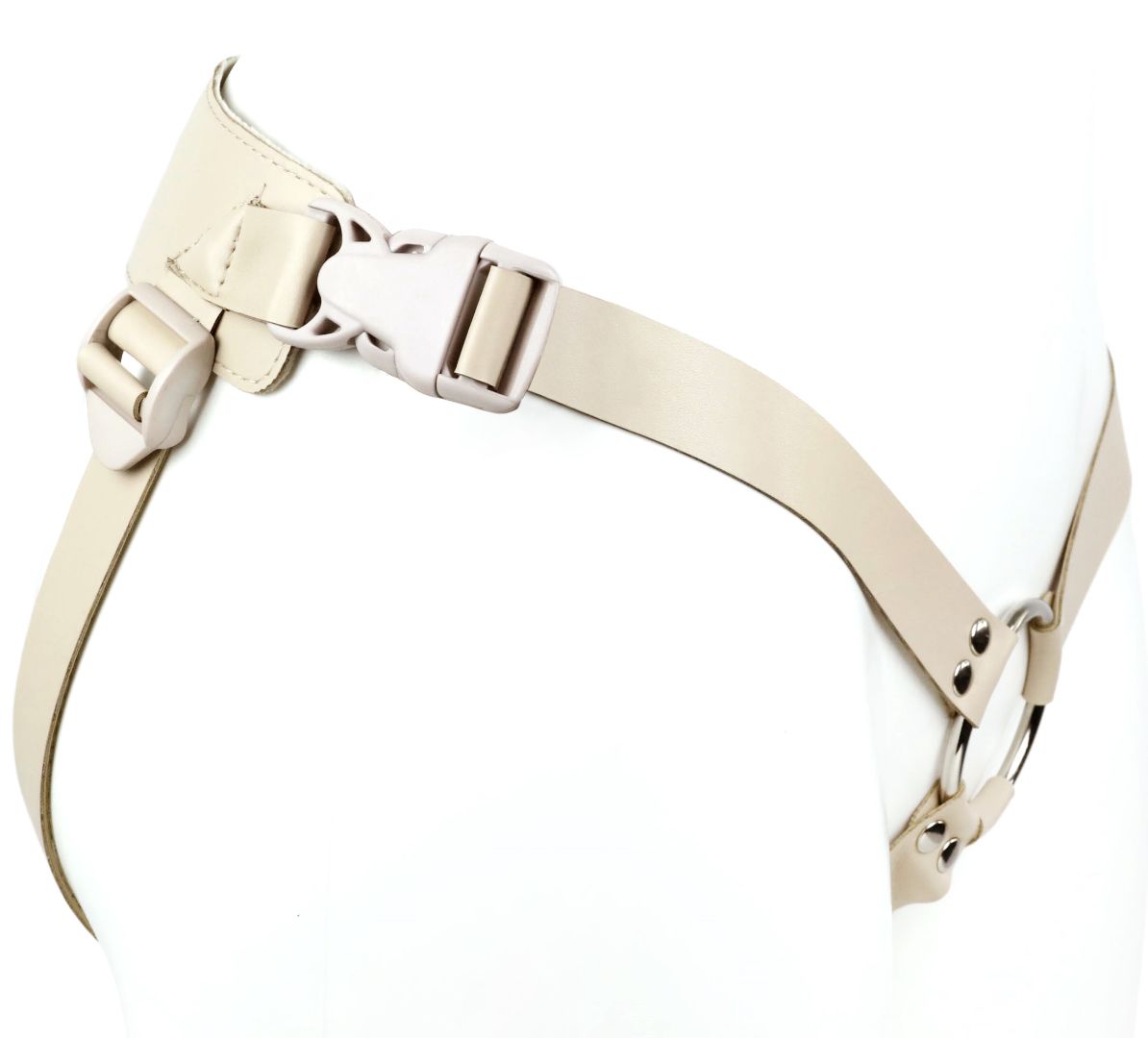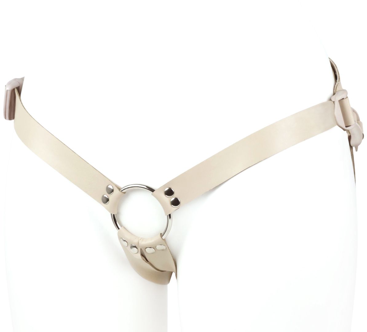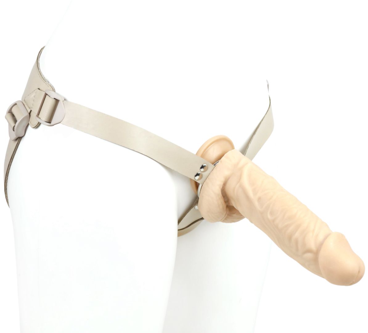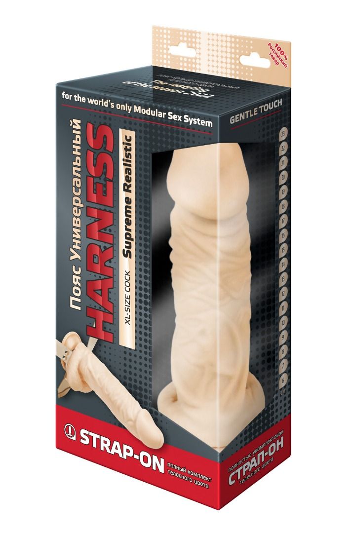 Пояс–кольцо: универсальный для реалистиков с присоской и плагов. Обновленная версия пояса, снабженная кожаным бандажным поясом на бархатном основе и фастексами-быстросьемами. Модель подходит как мужчинам, так и женщинам. Регулируется по форме тела всего один раз. Дальше просто расстегивается с помощью пряжек-фастексов и надевается в следующий раз, как готовое лекало. Металлическое кольцо в конструкции харнесса – позволяет использовать любые фаллоимитаторы с присоской и большинство плагов. В данной комплектации пояс предлагается в телесной цветовой гамме как насадки, так и фаллоимитатора. Размер пояса – 40-64.
