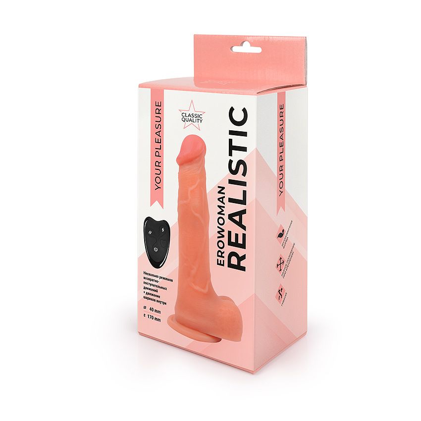 Реалистичный вибромассажёр с разнообразными режимами возвратно-поступательных движений. Внутри изделия расположены небольшие шарики, которые при вращении дополнительно стимулируют эрогенные зоны во время интимной близости. В комплект входит USB провод для зарядки изделия, дистанционный пульт, батарейка для пульта. Для включения/выключения вибромассажёра необходимо нажать и две секунды удерживать нижнюю кнопку на его корпусе. Переключение возвратно-поступательных режимов и вращения шариков осуществляется с помощью краткого нажатия верхней кнопки. Для управления работой эротического аксессуара с помощью пульта, необходимо сначала нажать кнопку включения/выключения на его корпусе, а затем использовать кнопки на самом пульте. Выключить секс-игрушку также можно с помощью соответствующей кнопки на пульте. Рабочая длина – 17 см.