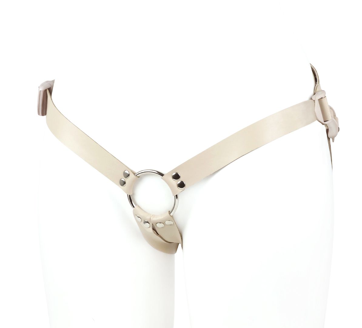 Пояс–кольцо: универсальный для реалистиков с присоской и плагов. Cнабжена кожаным бандажным поясом на бархатном основе и фастексами-быстросьемами. Модель подходит как мужчинам, так и женщинам. Регулируется по форме тела всего один раз. Дальше просто расстегивается с помощью пряжек-фастексов и надевается в следующий раз, как готовое лекало. Металлическое кольцо в конструкции харнесса позволяет использовать любые фаллоимитаторы с присоской. В данной комплектации пояс и насадка прилагаются в телесной цветовой гамме. Такой комплект предлагается для пар, которым важна естественность и максимальная схожесть с обычным интимным контактом.