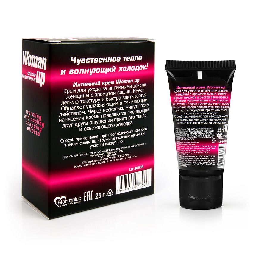 Женский возбуждающий крем Woman up с волнующим ароматом вишни. Раскрывает чувственность и раскрепощает, дарит потрясающие ощущения во время интимной близости. Через несколько минут после нанесения Woman up появляются волнообразные ощущения…