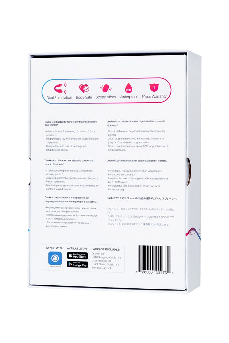 Dolce (ранее Quake) – это сверхмощная игрушка, которая обеспечивает двойную стимуляцию клитора и зоны G одновременно – регулируемая шейка позволяет вам настроить идеальную форму и обеспечить смешанные интенсивные оргазмы. Двойной мотор. Двойная мощность. Двойной оргазм – стимуляция зоны G и клитора одновременно. Гибкая шейка. Регулируемая шейка позволяет подстроить игрушку под любую физиологию, обеспечивая лучший угол соприкосновения с клитором и зоной G. Наслаждайтесь интенсивными клиторальными и вагинальными оргазмами в одно и то же время, исследуя себя, даря себе глубокие ощущения по всему телу. Программируемая функция. Настраивайте уровни мощности вибрации по своему вкусу и сохраняйте их для дальнейшего использования. Также запрограммируйте до 10 любимых паттернов! Стабильное подключение. Антенна новейшего поколения и чип Bluetooth для любителей игр на большом расстоянии. Многофункциональное приложение позволяет выбрать уровень мощности и разнообразные паттерны и ритмы, соответствующий вашим индивидуальным потребностям. Сильные вибрации. Гладкое силиконовое покрытие и сверхсильные вибрации обеспечивают потрясающие оргазмы. Рабочая длина – 12 см. Диаметр второй части – 2,6 см.