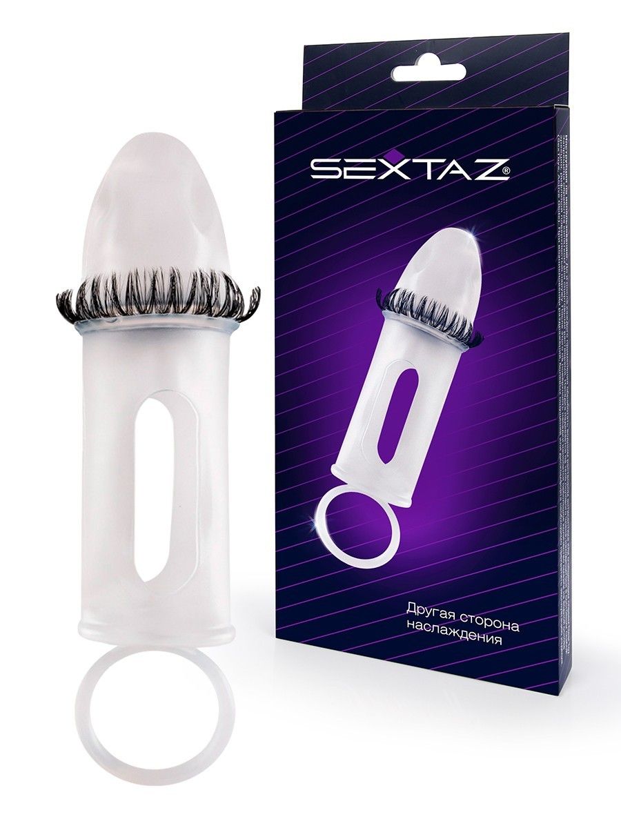 Закрытая насадка на пенис с подхватом мошонки и стимулирующими «ресничками»