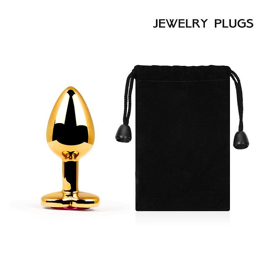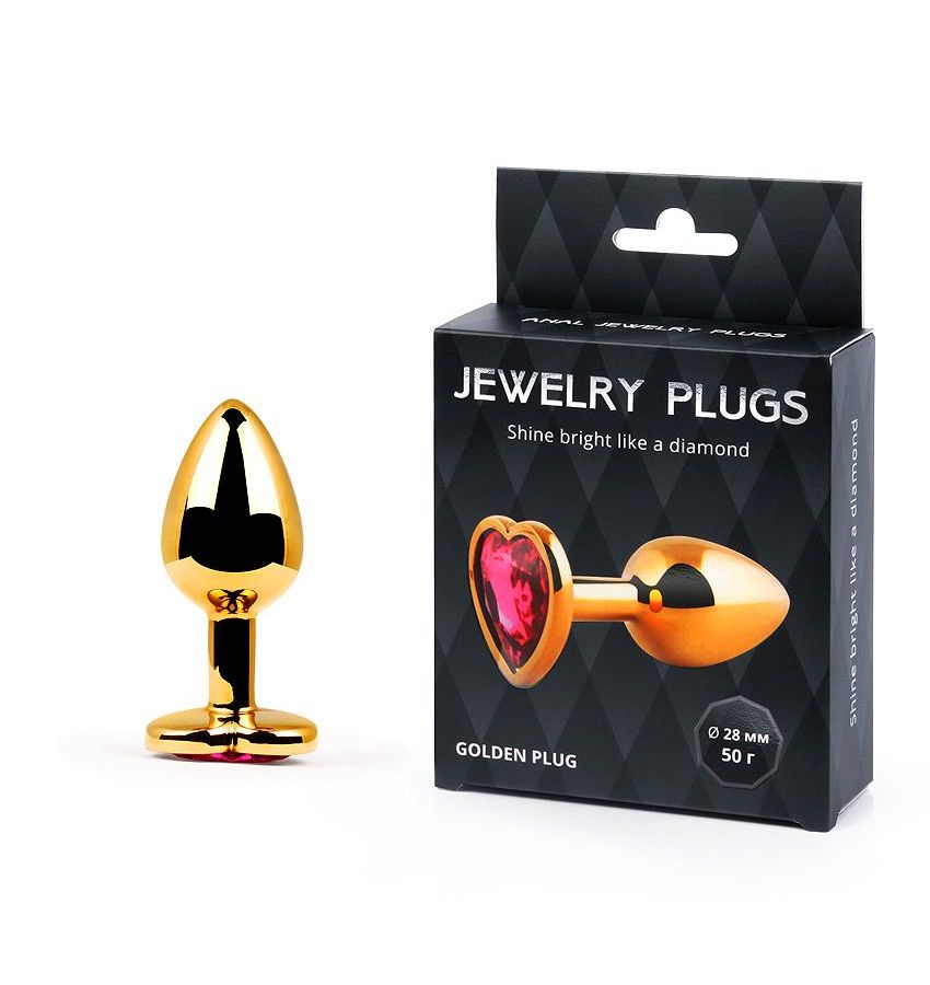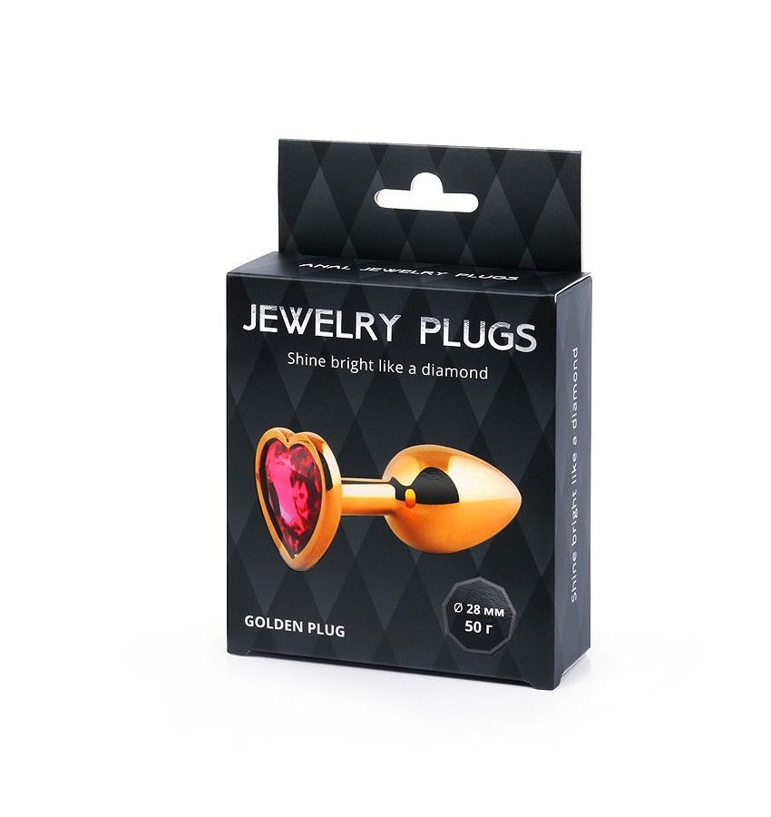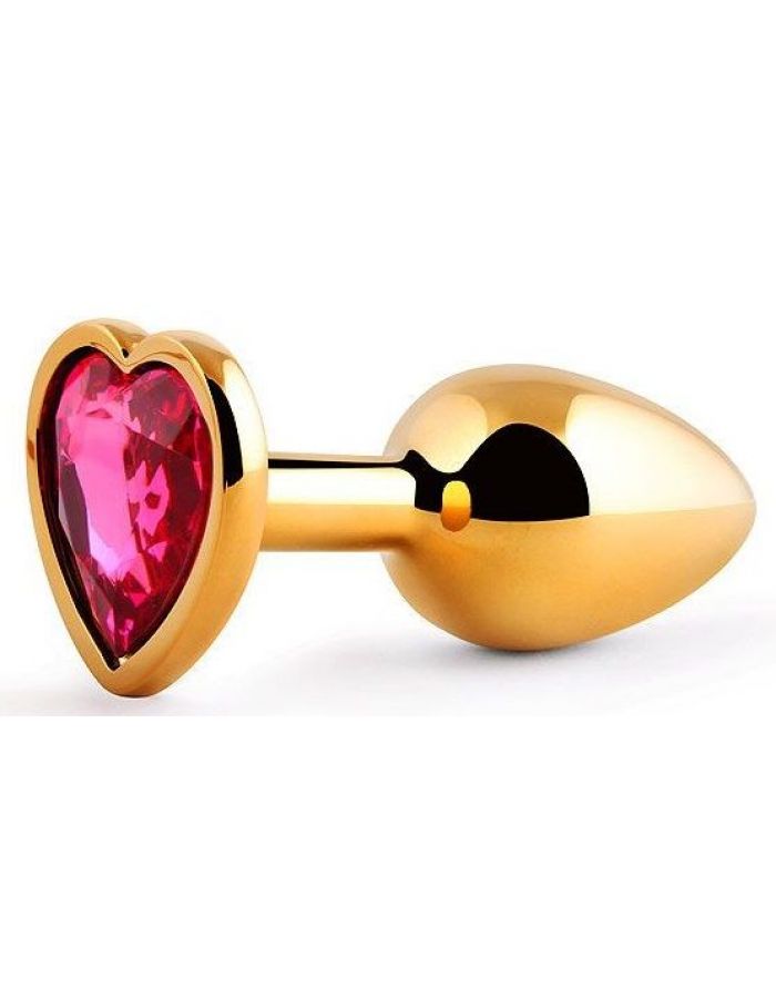 Золотистая анальная пробка с малиновым кристаллом-сердечком – 7 см.